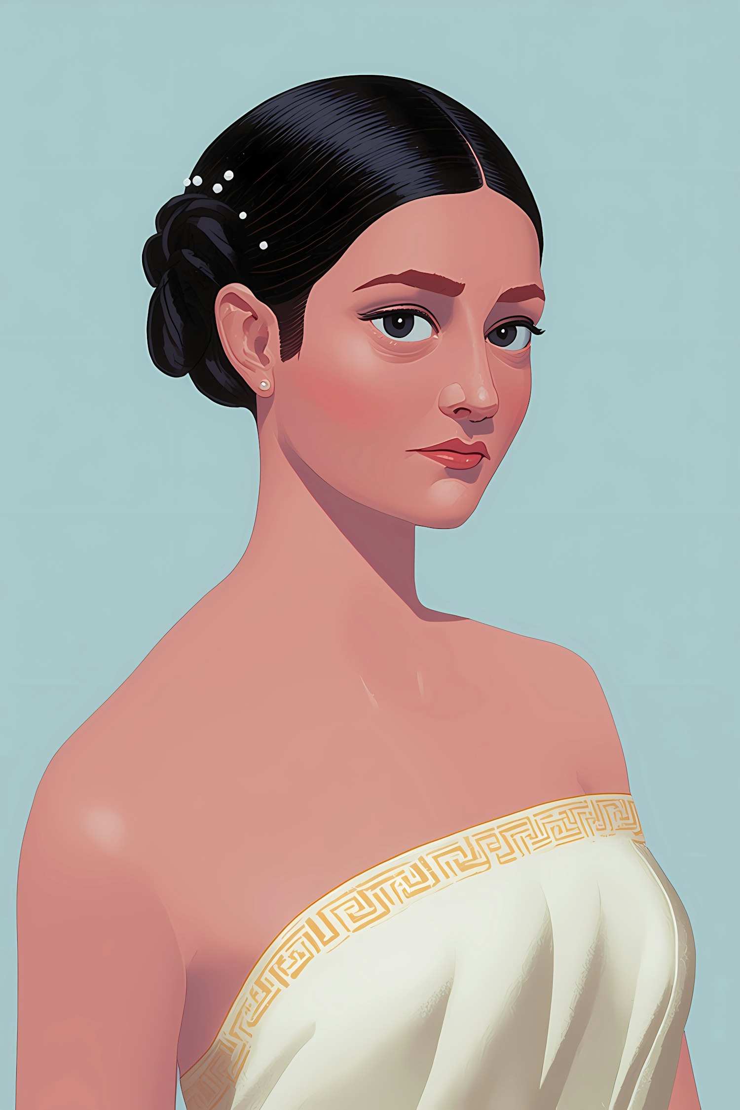 Elegant digital illustration of a woman with dark hair, pearl accents, and a white garment with golden details, set against a light blue background.