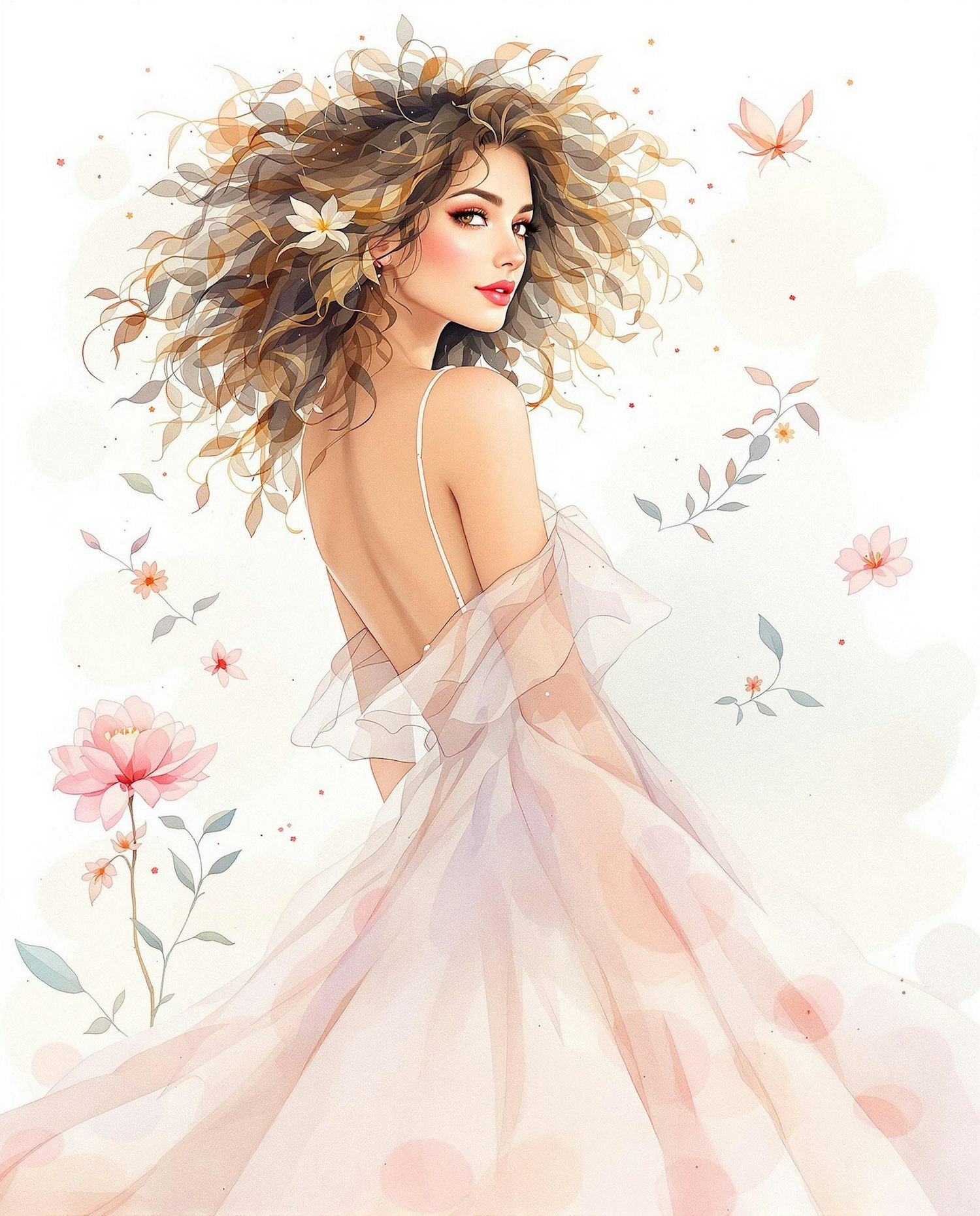 A watercolor portrait of a curly-haired woman in a flowy dress, looking over her shoulder, surrounded by floating botanical elements, subtle color splashes and transparent layers