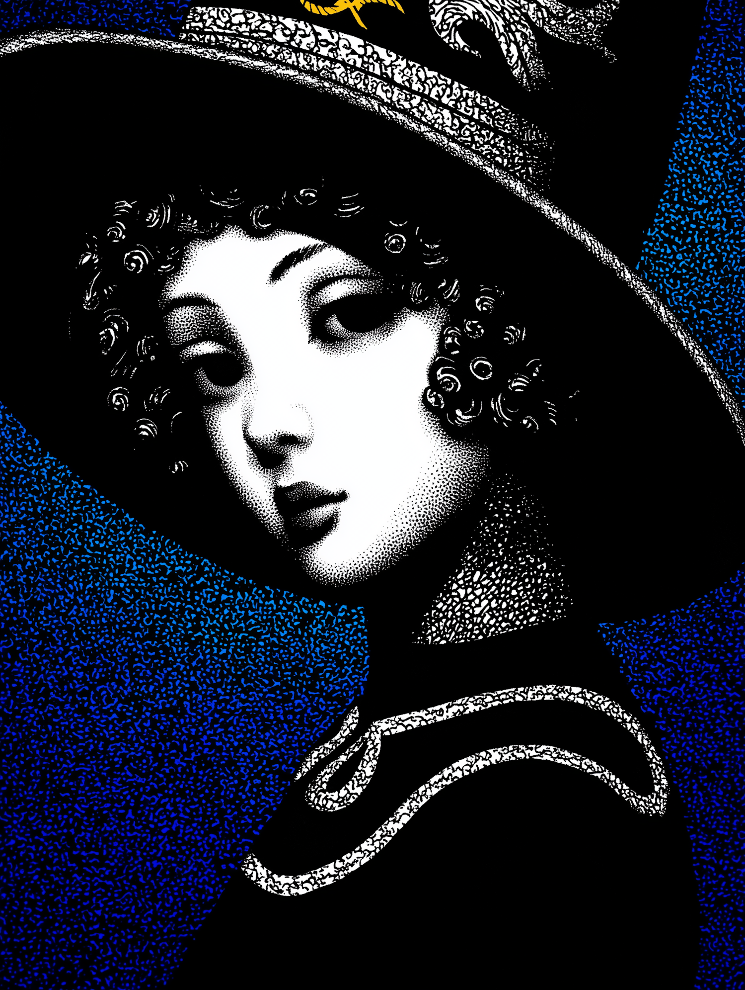 Stylized illustration of a woman in a black hat with golden accents, curly hair, and a textured blue background. Vintage and elegant vibe.