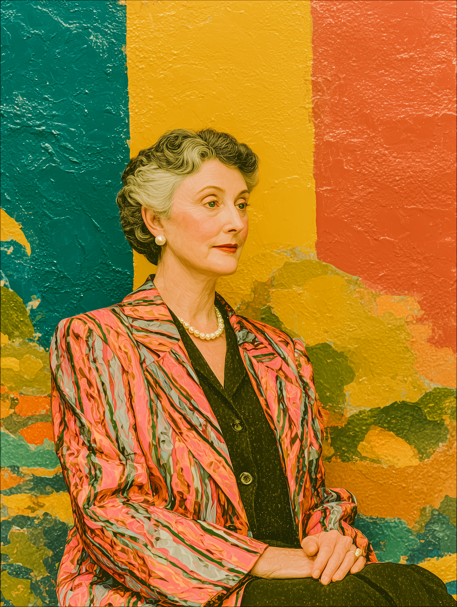 Elegant woman with salt-and-pepper hair in a vibrant striped blazer, seated against a bold, colorful textured background.