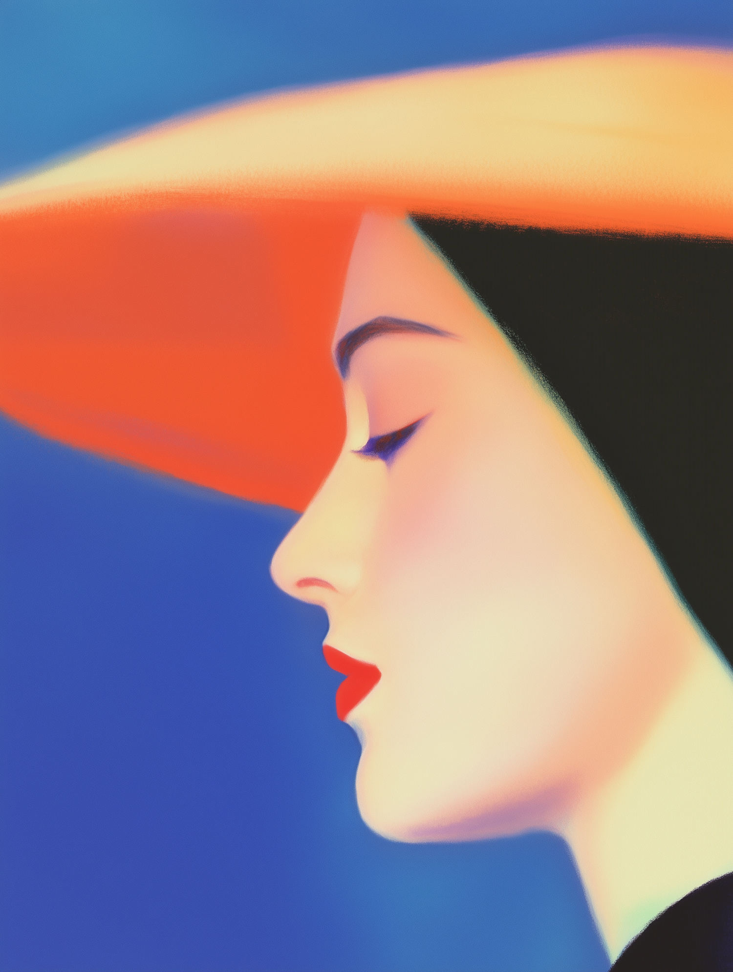 Stylized profile of a woman with a bold orange hat, red lips, and serene expression against a gradient blue background.