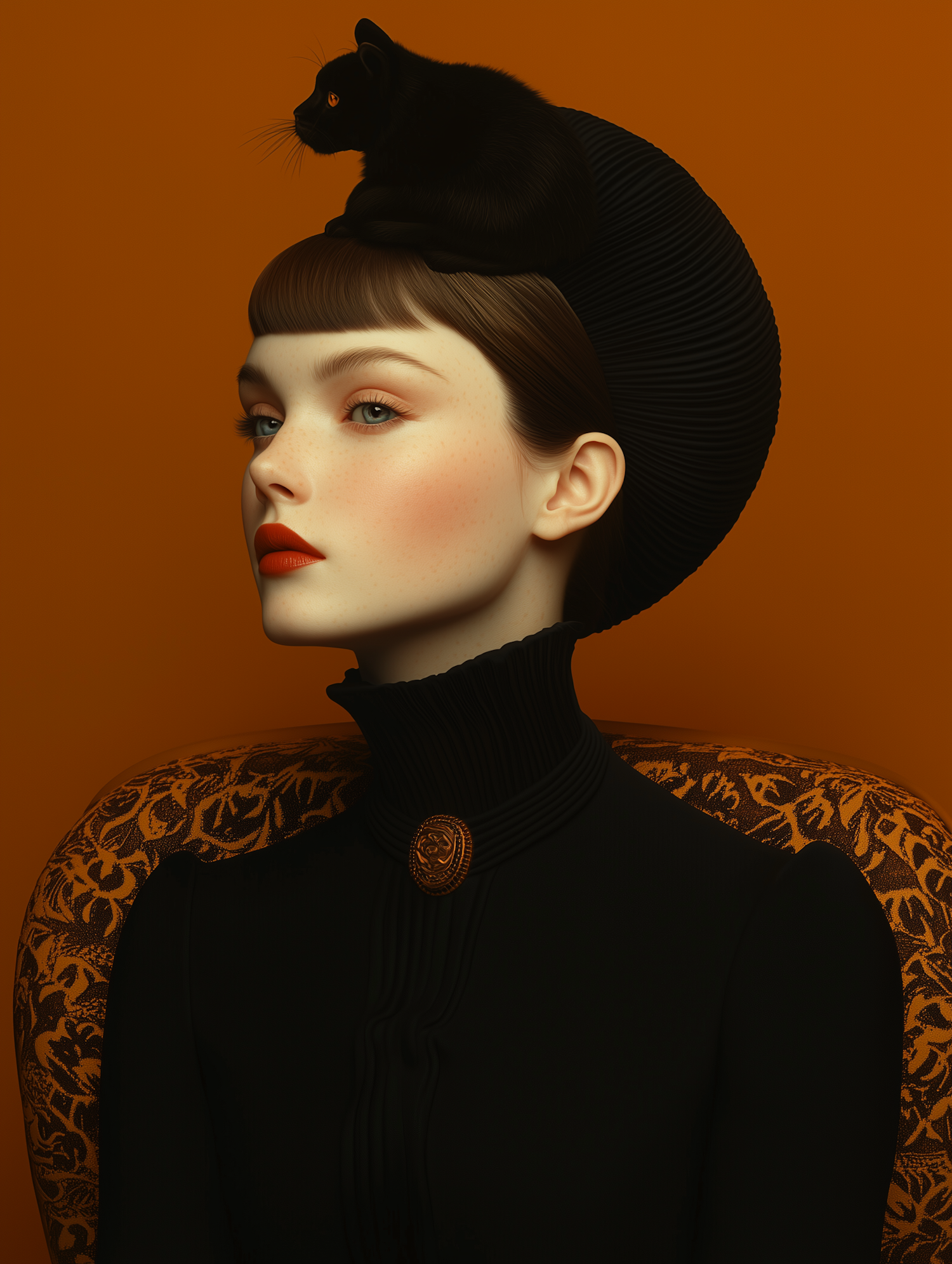 Stylized portrait of a woman in black attire with a black cat on her head, set against a warm orange background.