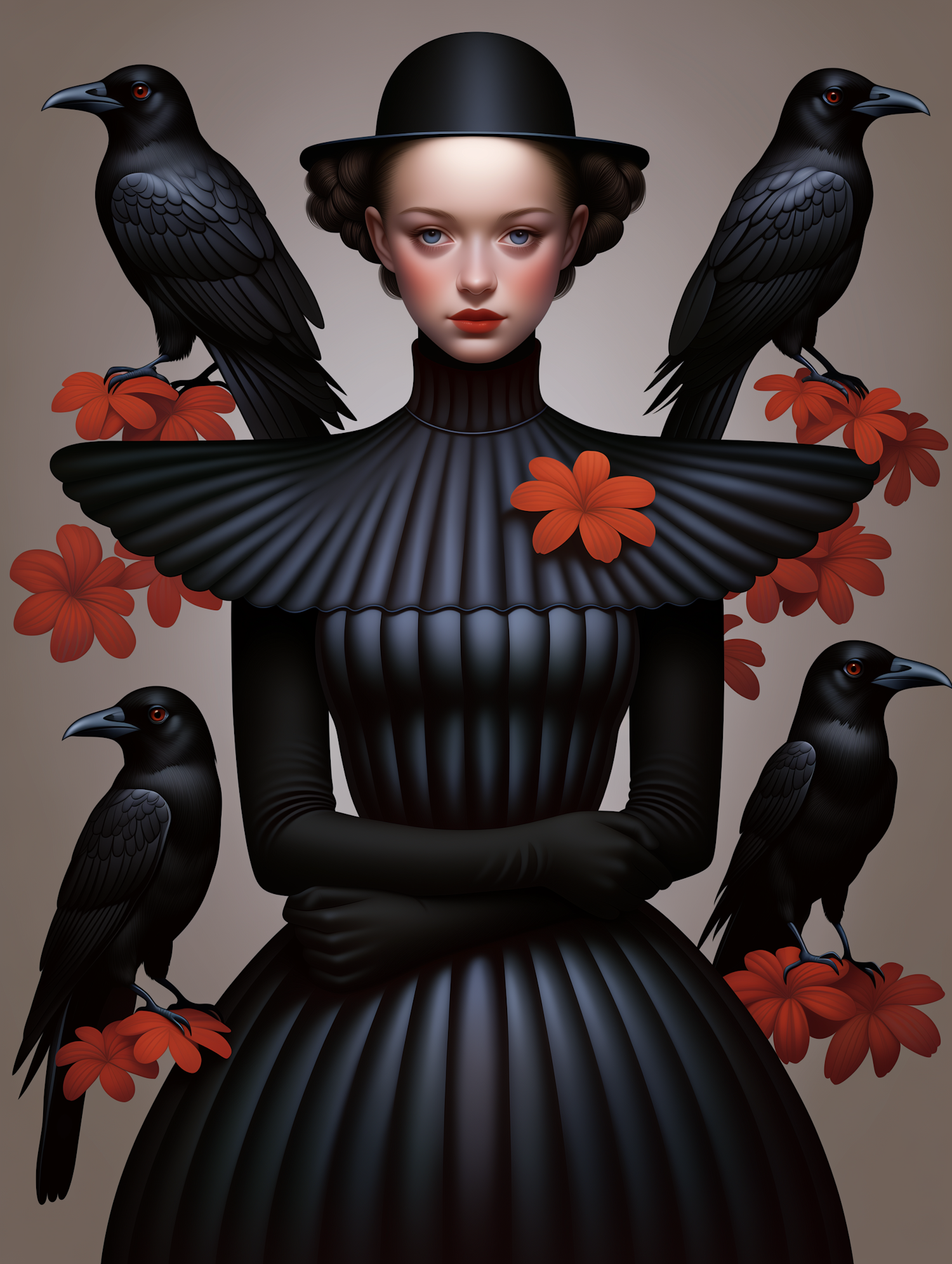 Stylized illustration of a woman in black attire with crows and red flowers, creating a striking and artistic composition.