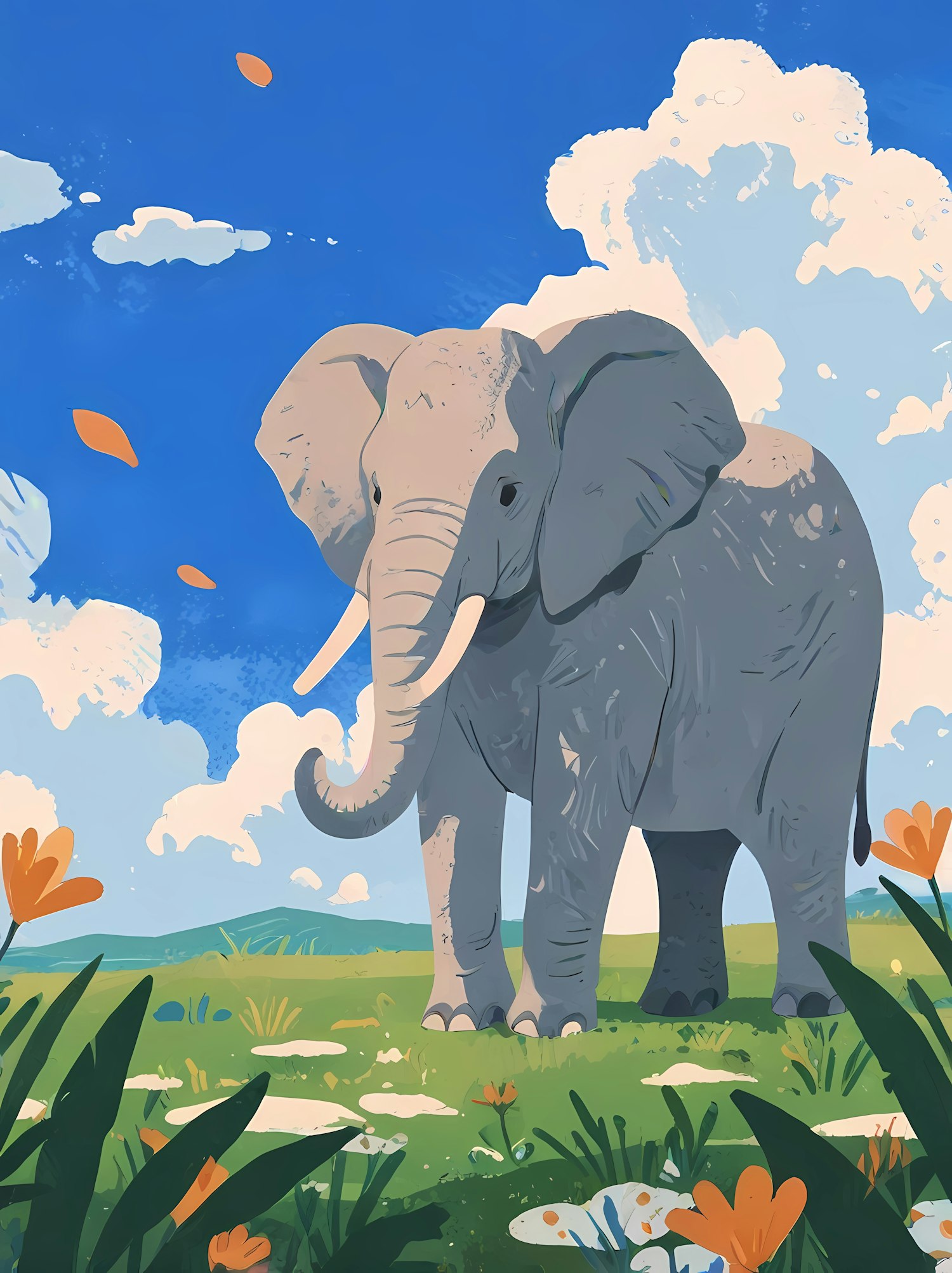 A charming illustration of an elephant in a vibrant field with flowers and a bright blue sky, evoking a serene and cheerful vibe.