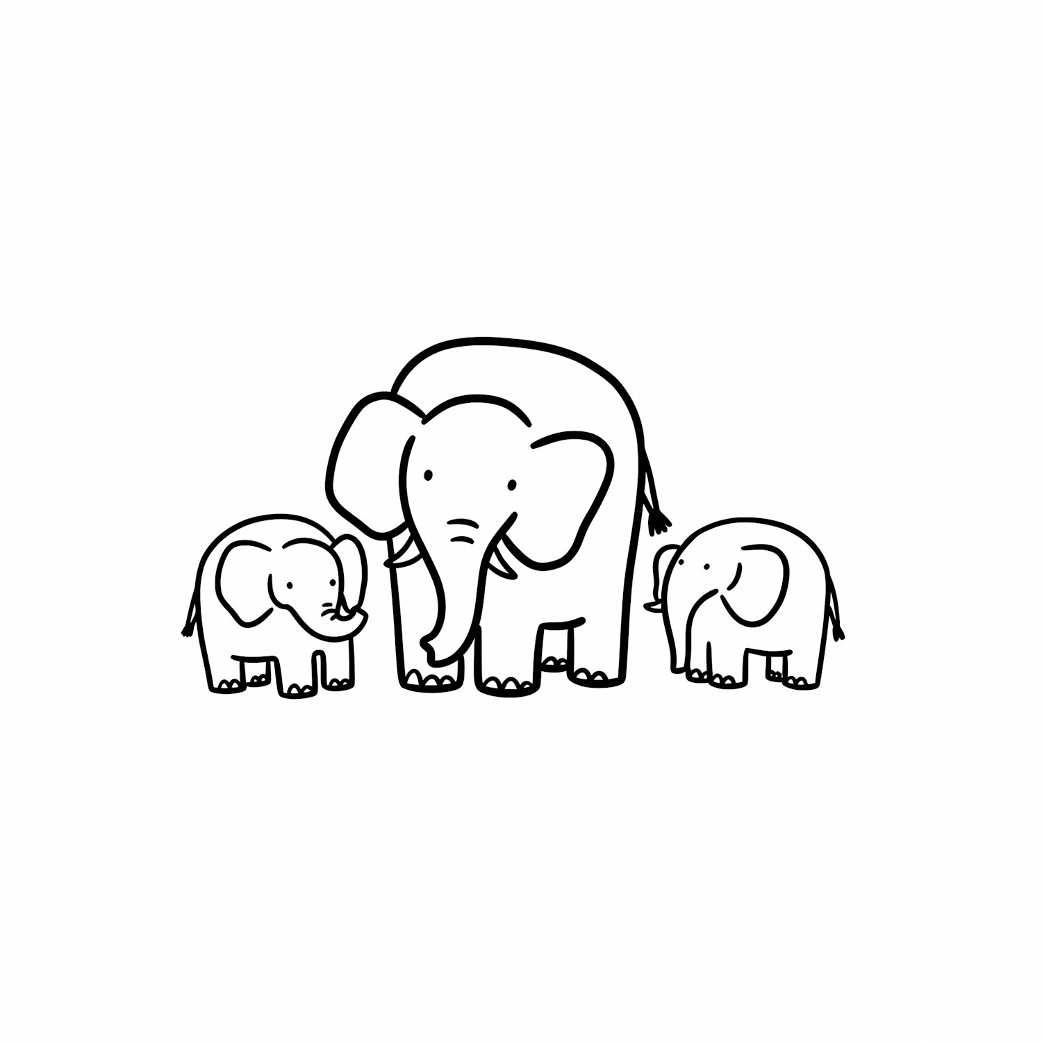 A charming black-and-white cartoon illustration of a family of elephants, featuring a parent and two calves in a minimalistic style.