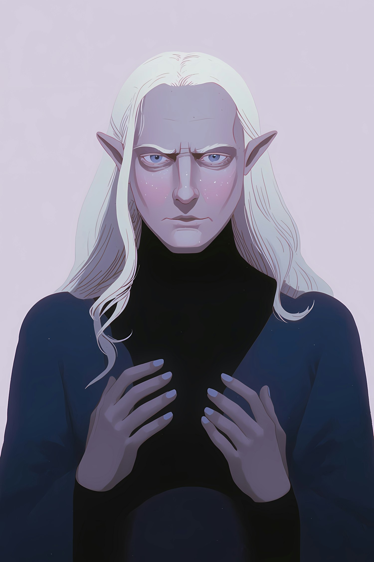 A striking illustration of a fantasy character with white hair, pointed ears, and a serious expression, set against a soft lavender background.