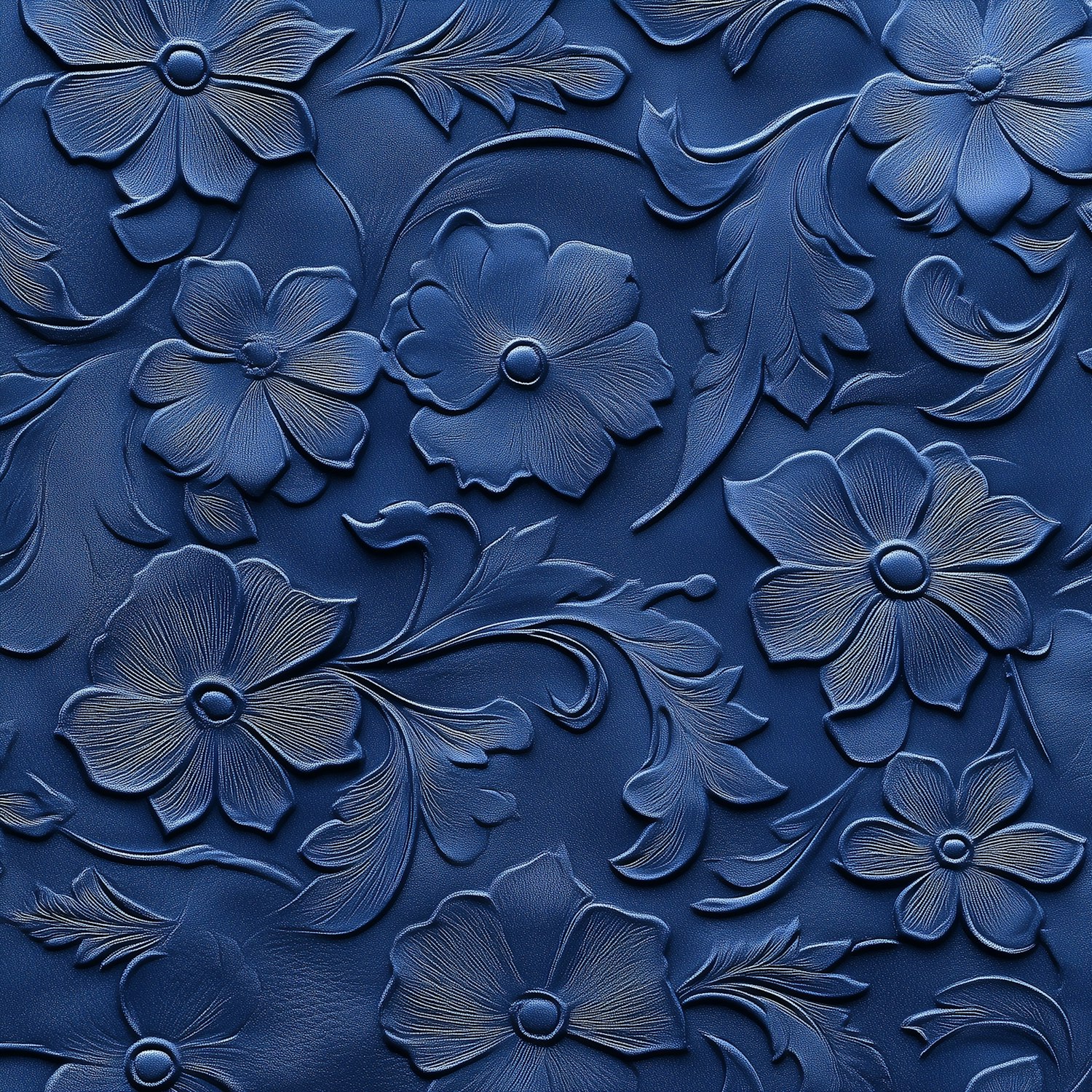 Elegant embossed floral pattern on a deep blue background, featuring intricate flowers and swirling leaves with a 3D textured effect.