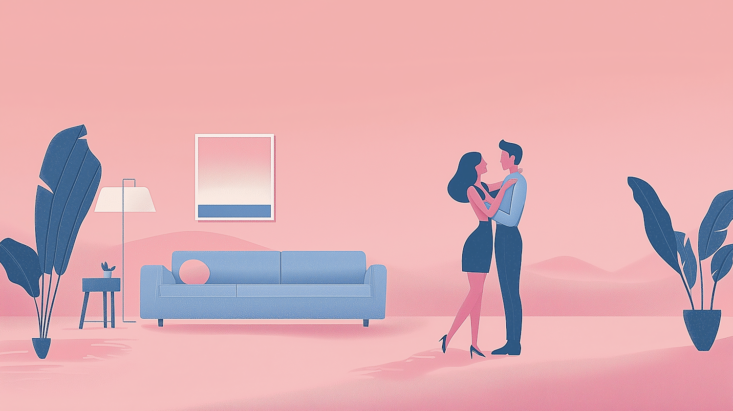 Minimalist illustration of a couple in a modern living room with pink hues, blue sofa, and potted plants, creating a romantic atmosphere.
