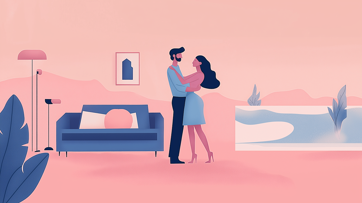 Stylized illustration of a couple embracing in a modern, pastel-toned living room with abstract decor.