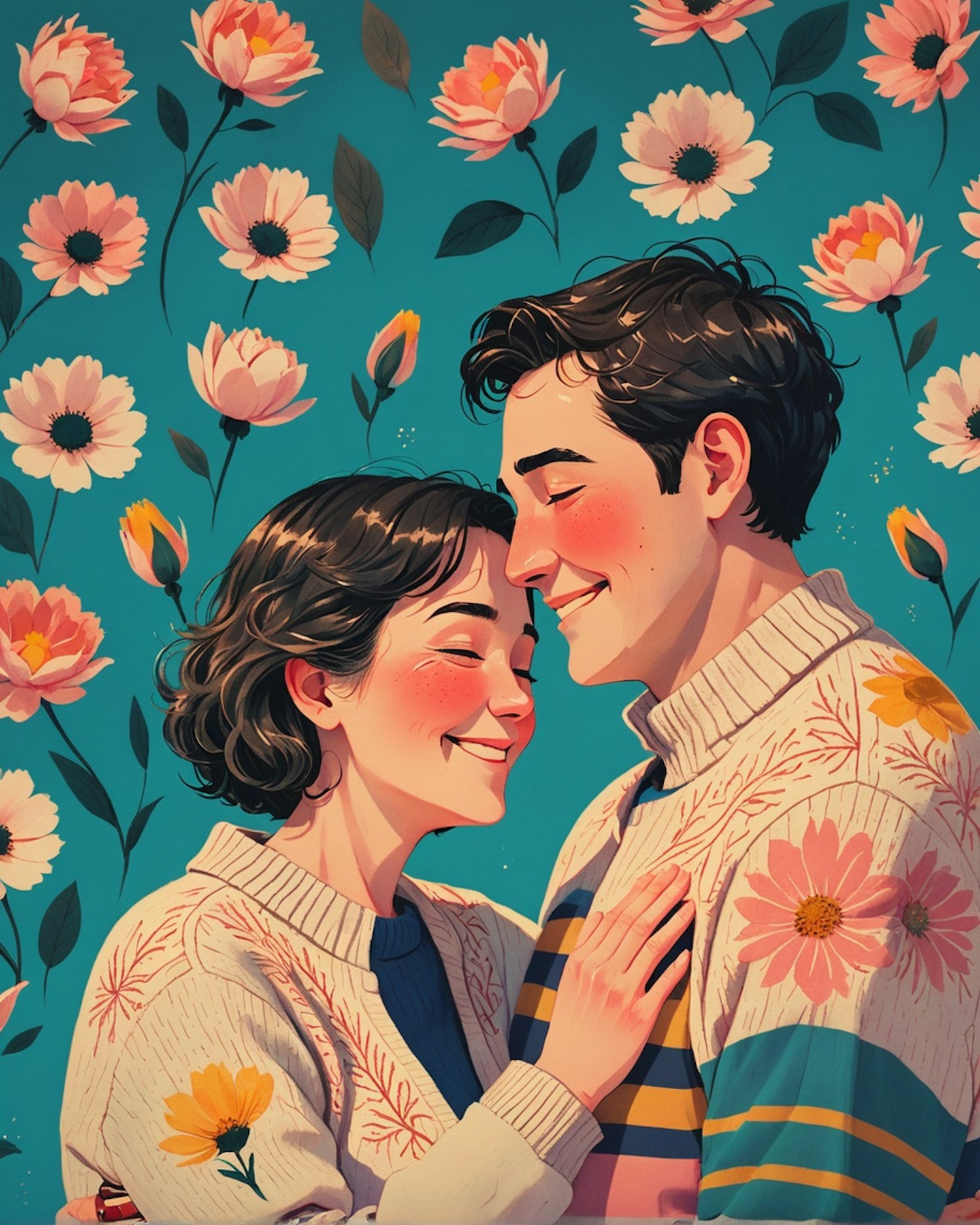 Romantic illustration of a couple in floral sweaters against a teal background with pink flowers. Whimsical and joyful vibe.