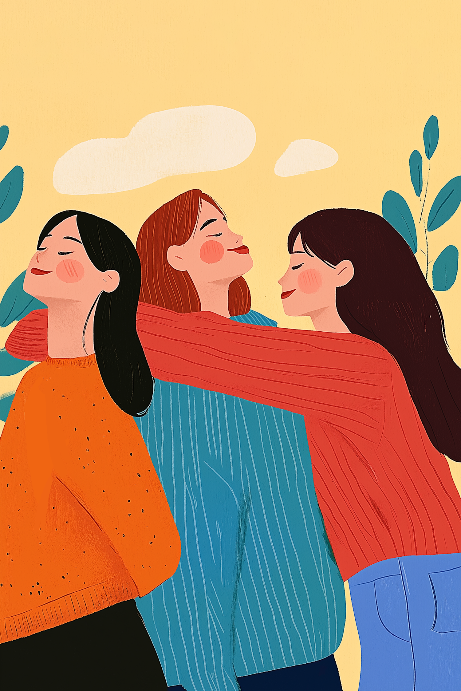 Three women in colorful sweaters enjoy a serene moment with closed eyes against a whimsical yellow background.