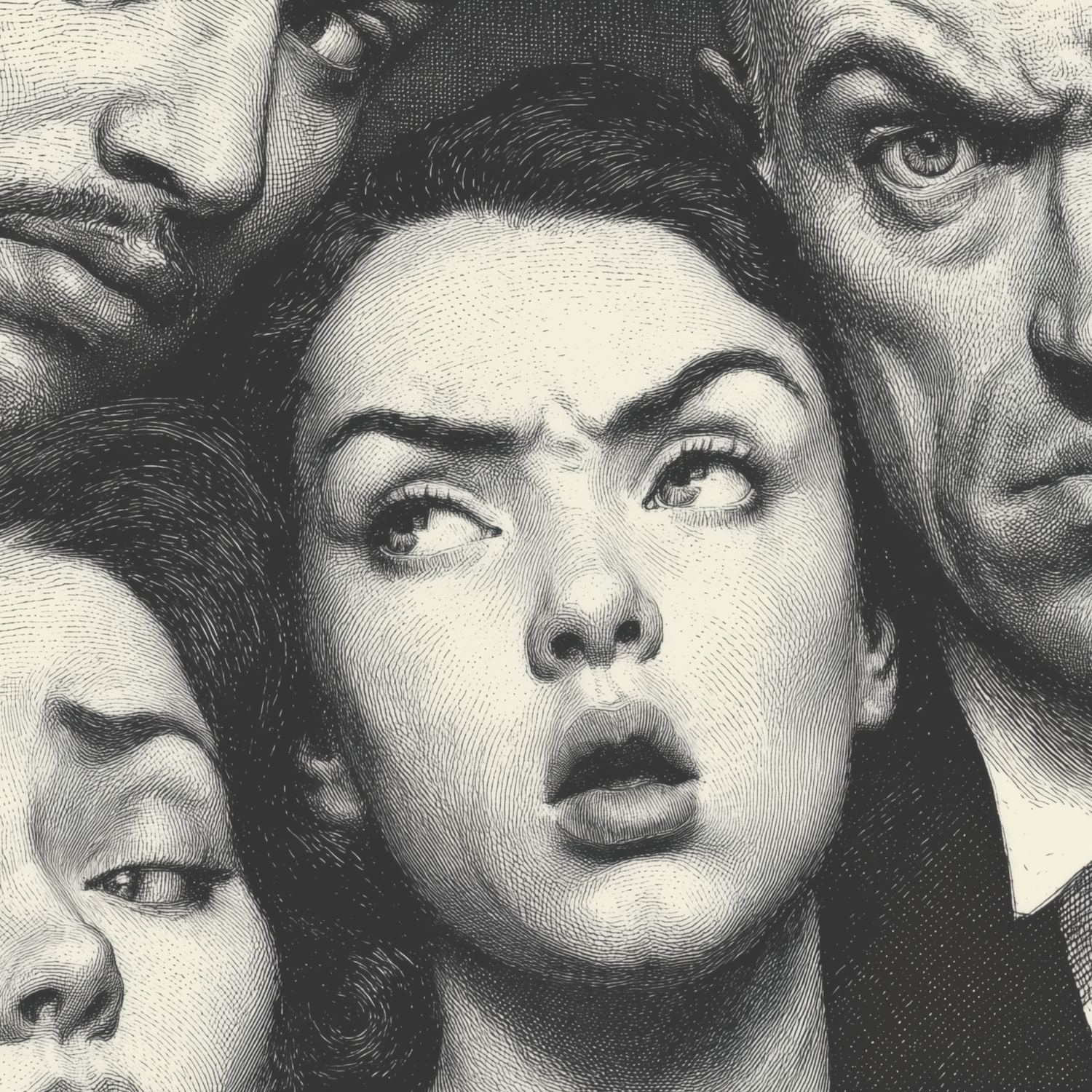 Intricate black-and-white illustration of four expressive faces, showcasing a range of emotions with detailed cross-hatching artistry.