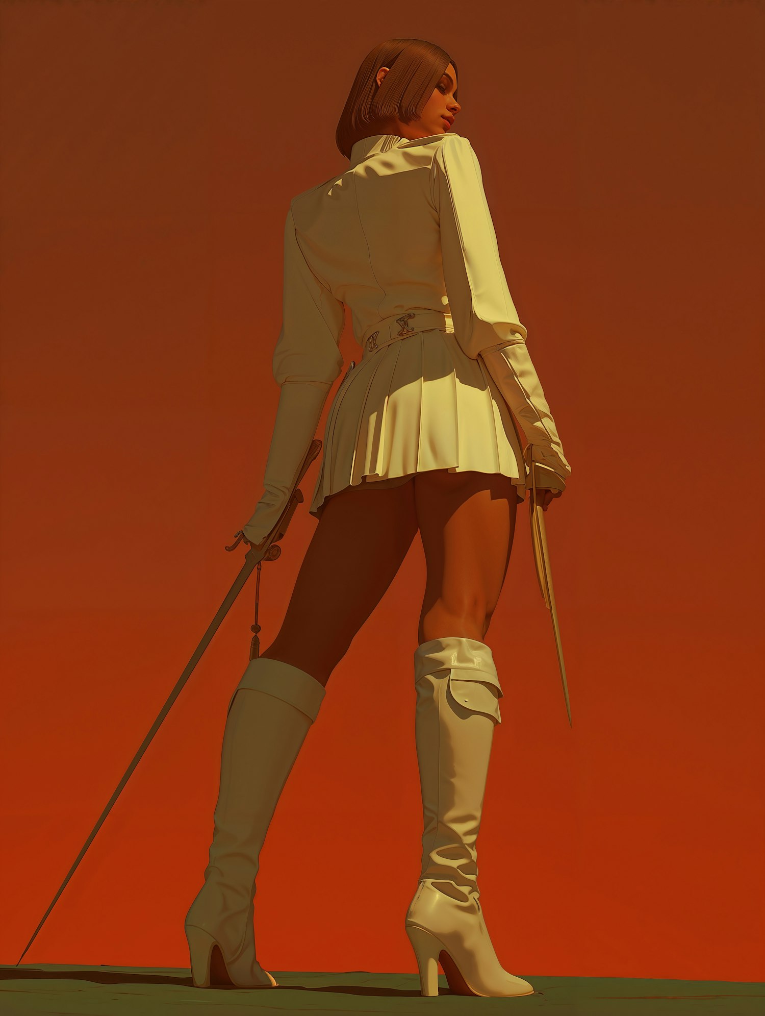 A woman in a white outfit with swords stands against a vibrant orange background, exuding power and elegance.