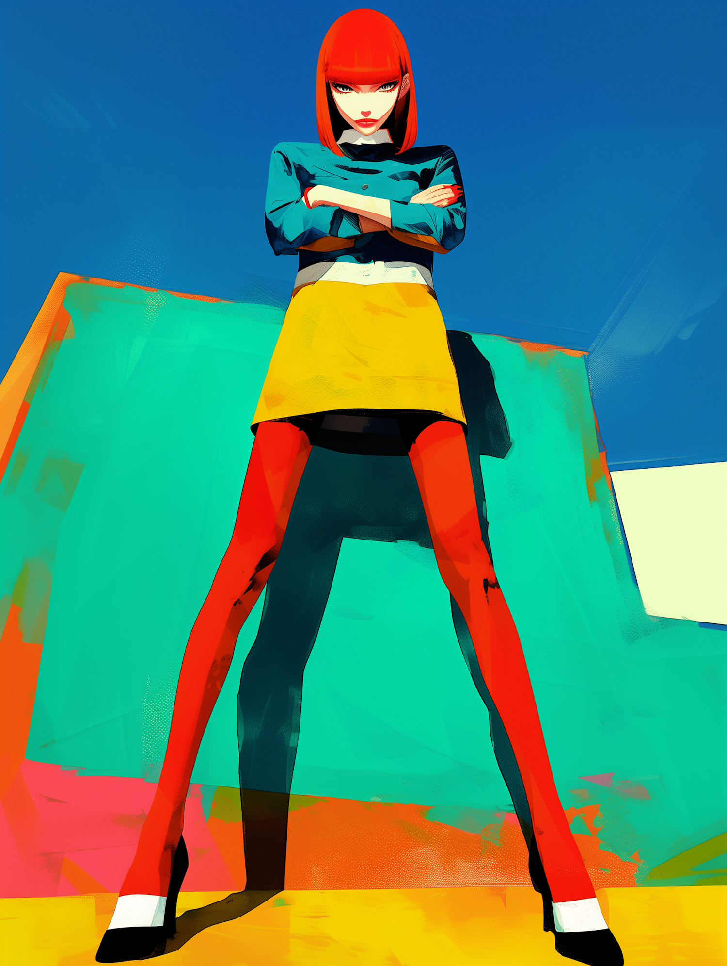 Bold illustration of a confident woman with red hair, teal top, yellow skirt, and red tights against a vibrant background.