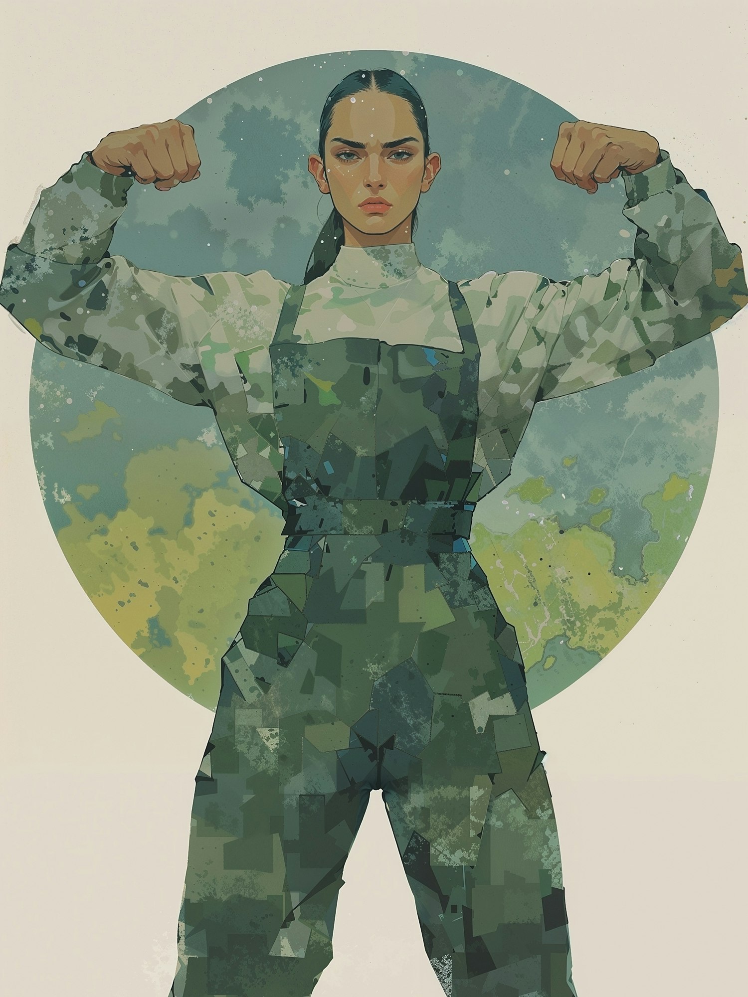 Illustration of a strong woman in a camouflage jumpsuit, flexing her arms with a determined expression against a bold abstract background.