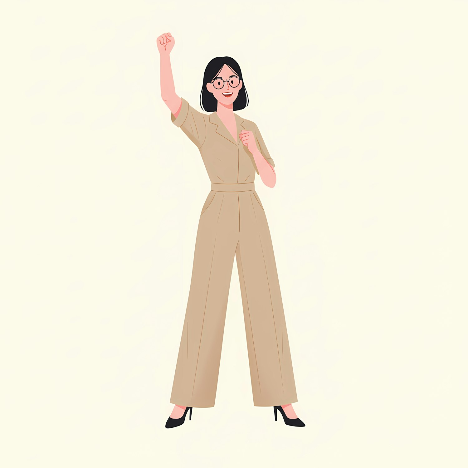 Illustration of a confident woman in a beige jumpsuit raising her fist, symbolizing empowerment and determination.