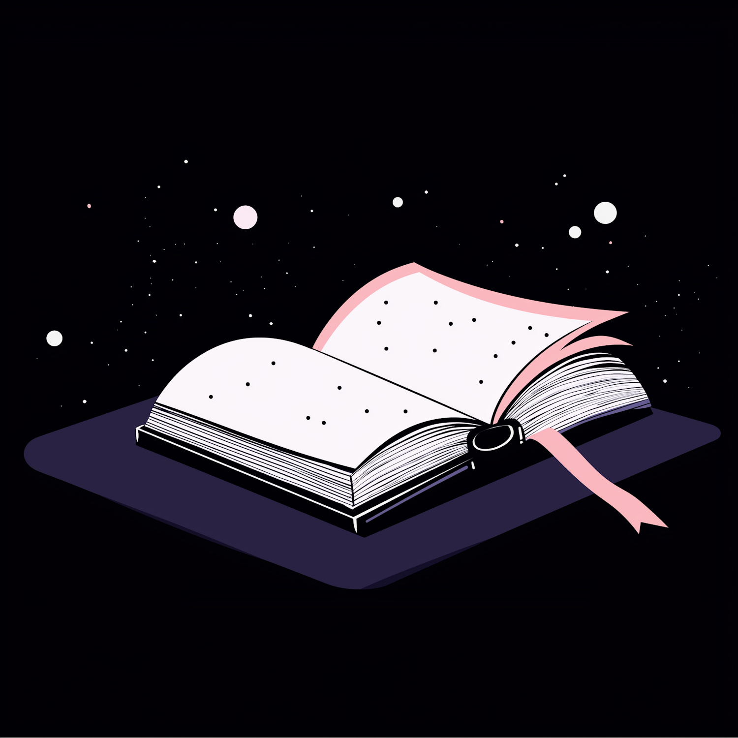 Illustration of an open book with starry pages and a pink ribbon, set against a dark, celestial-themed background.