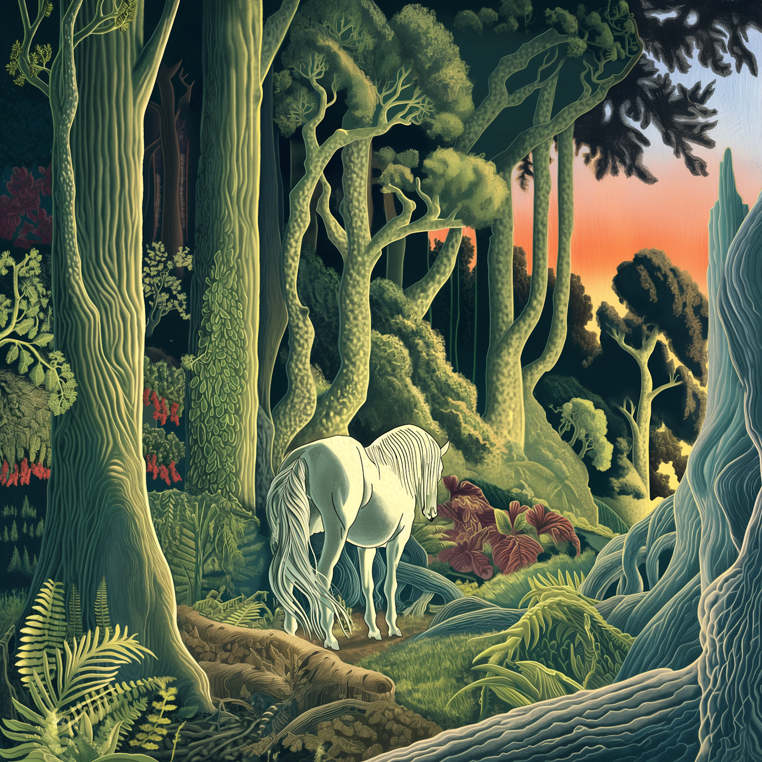 A white horse grazes in a lush, magical forest with vibrant foliage and a glowing sunset in the background. A serene, dreamlike scene.