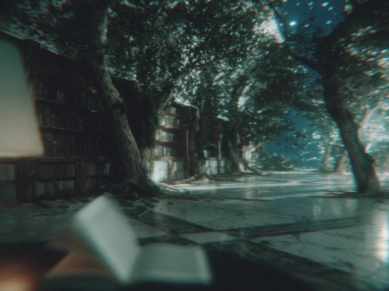 A mystical library intertwined with nature, featuring bookshelves merging with trees under a starry night sky.