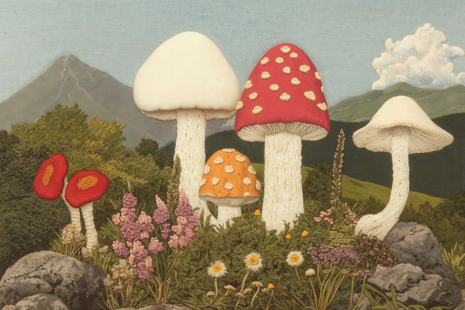 Whimsical illustration of colorful mushrooms and wildflowers set against a serene mountain backdrop.