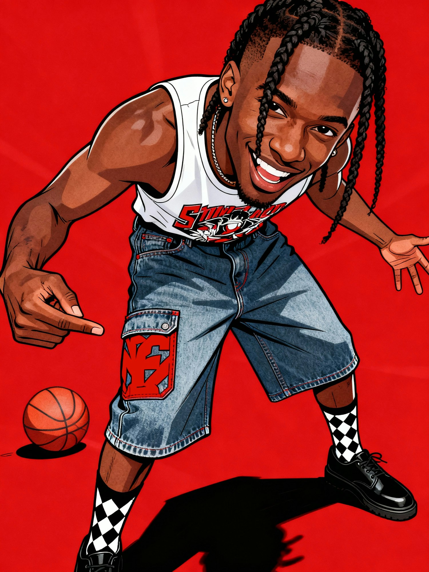 Stylish illustration of a young man in casual attire with a basketball, set against a bold red background, exuding energy and vibrancy.