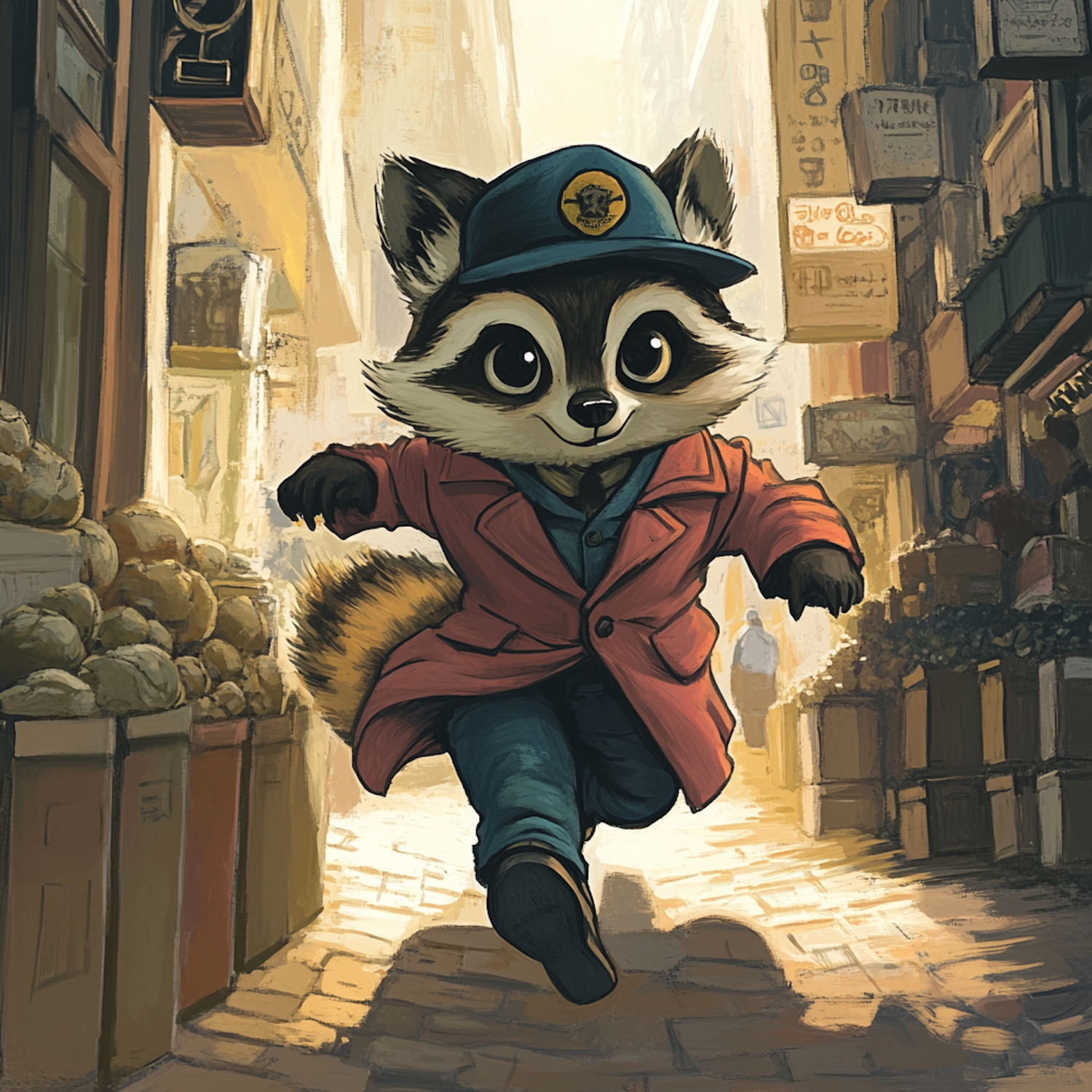 A playful raccoon in a red coat and blue cap runs down a lively street, surrounded by market stalls and signs.