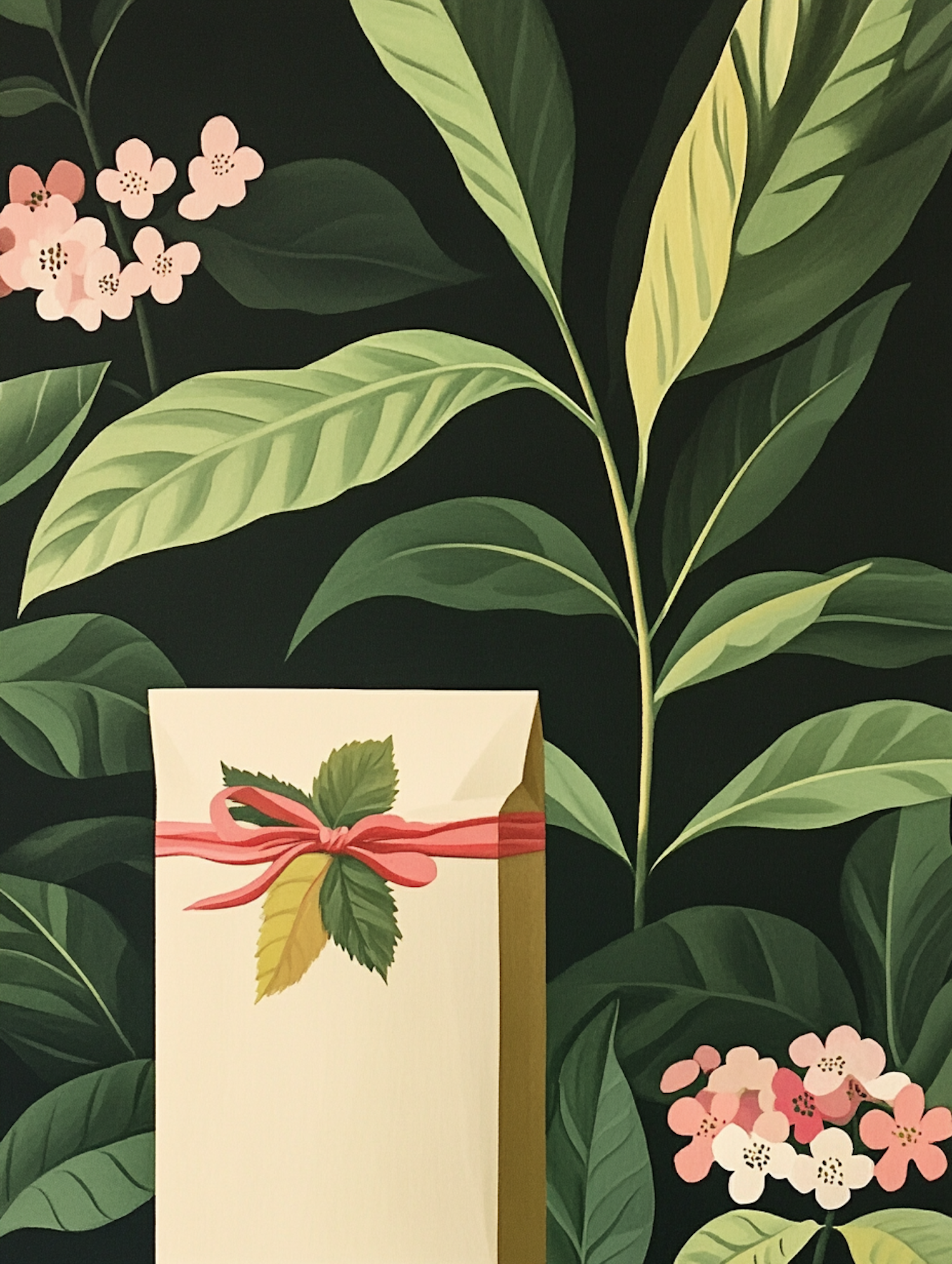 Elegant envelope with pink ribbon and leaves, set against lush green foliage and pink flowers. A harmonious and vibrant illustration.