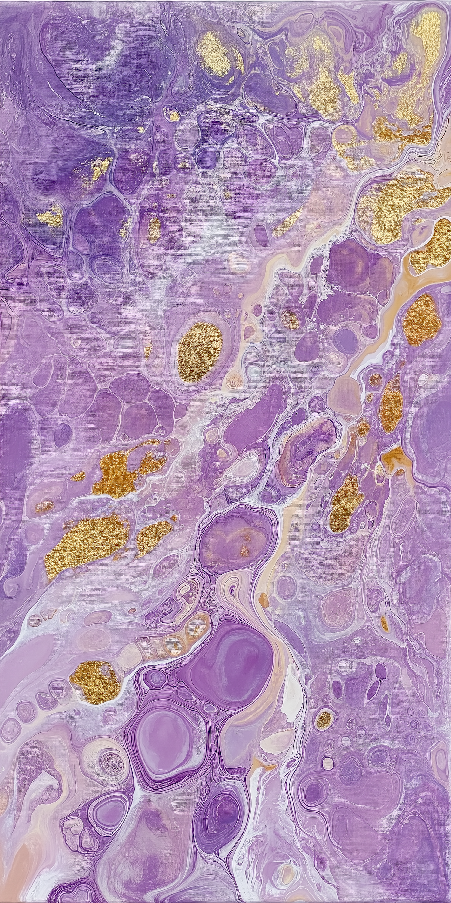 Abstract art with purple, lavender, and gold tones, featuring fluid, cell-like patterns and a dreamy, flowing texture.