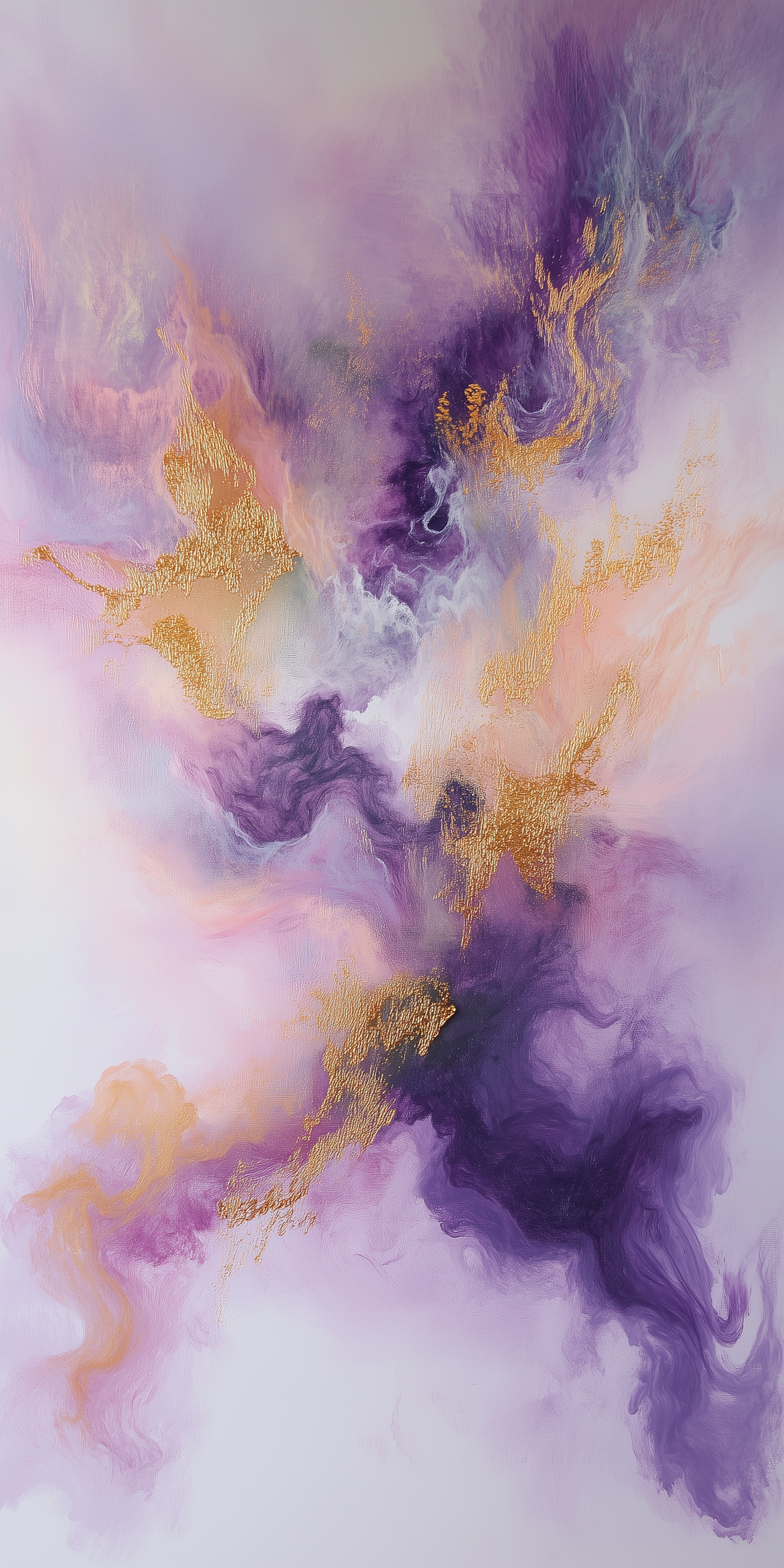 Abstract art with swirling purples, soft pastels, and shimmering gold accents, creating a dreamy and ethereal visual experience.