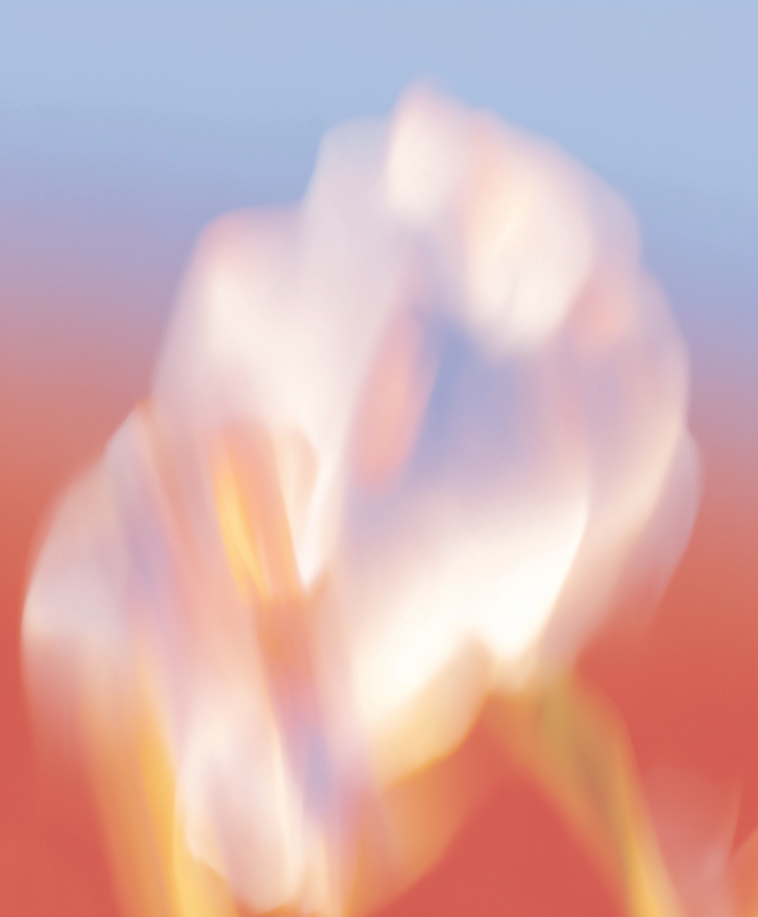 Abstract blurred image with warm orange and yellow tones blending into a cool blue background, evoking a dreamy and ethereal feel.