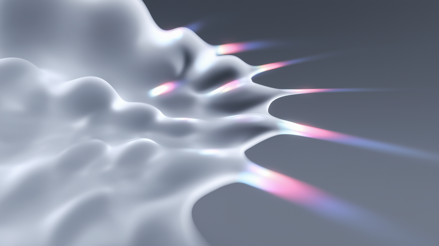 Abstract luminous material with iridescent highlights, creating an organic, fluid-like texture against a soft gray background.