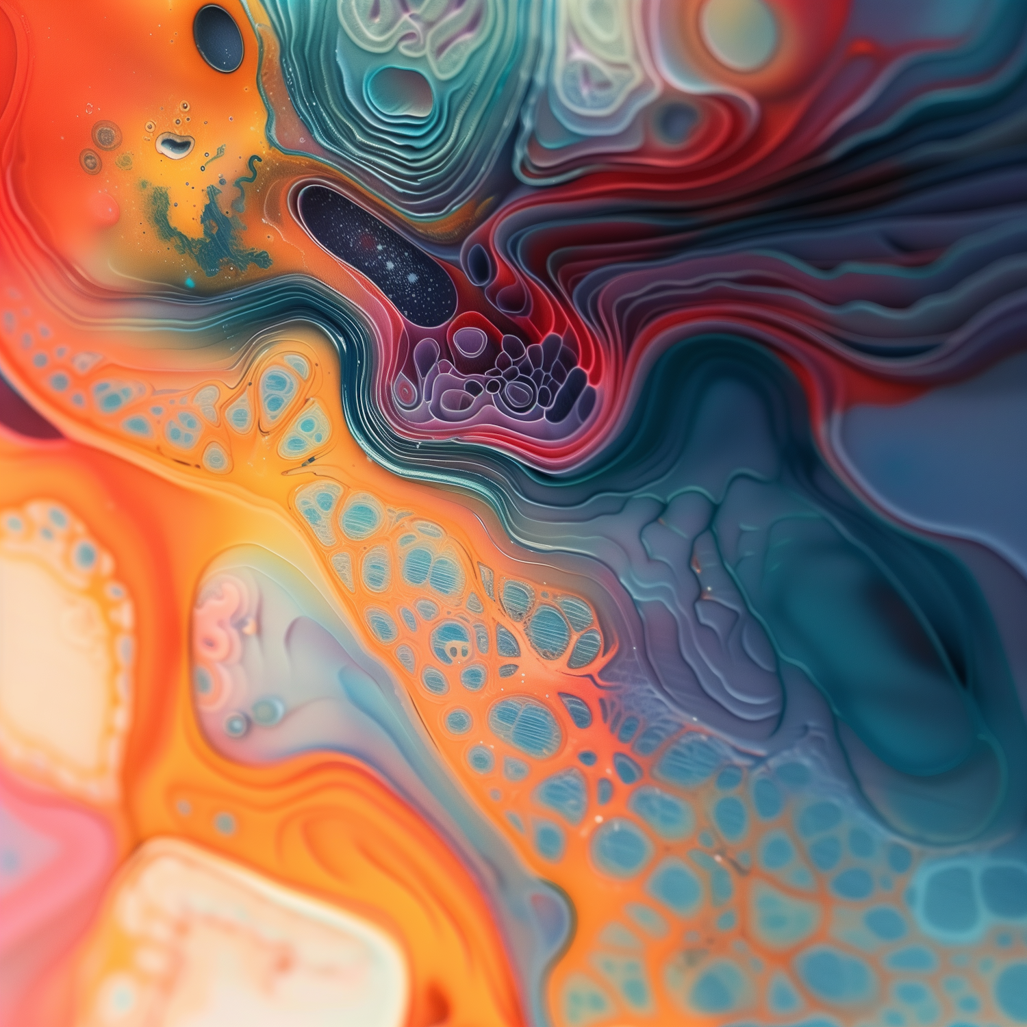 Vibrant abstract art with swirling patterns in orange, blue, and red hues, creating a dynamic and fluid visual experience.