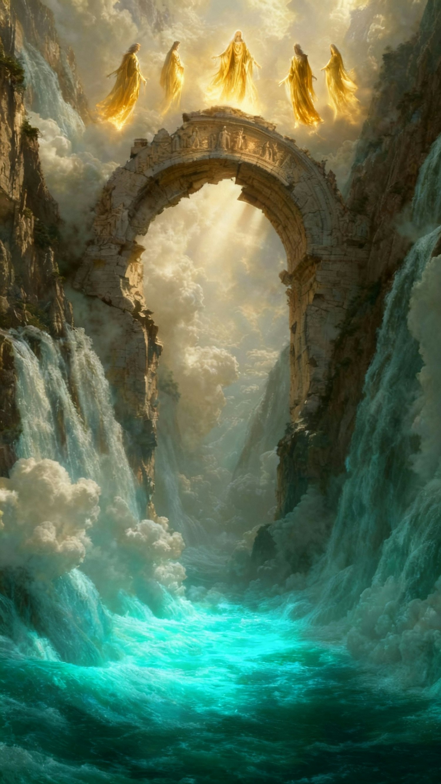 A stunning fantasy scene of a glowing archway over turquoise waters, with golden-robed figures floating in radiant light.