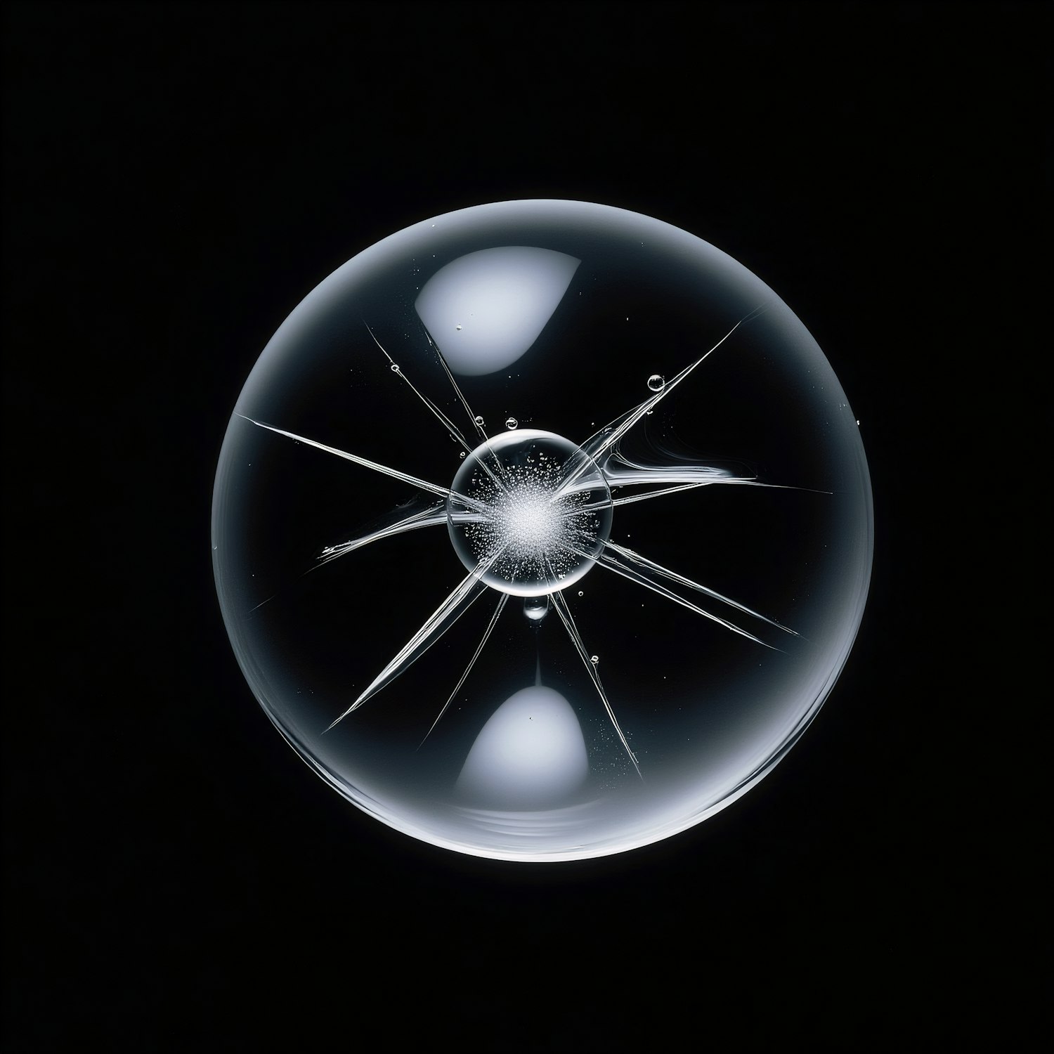 A transparent bubble with intricate starburst patterns inside, floating against a black background, creating a striking visual contrast.