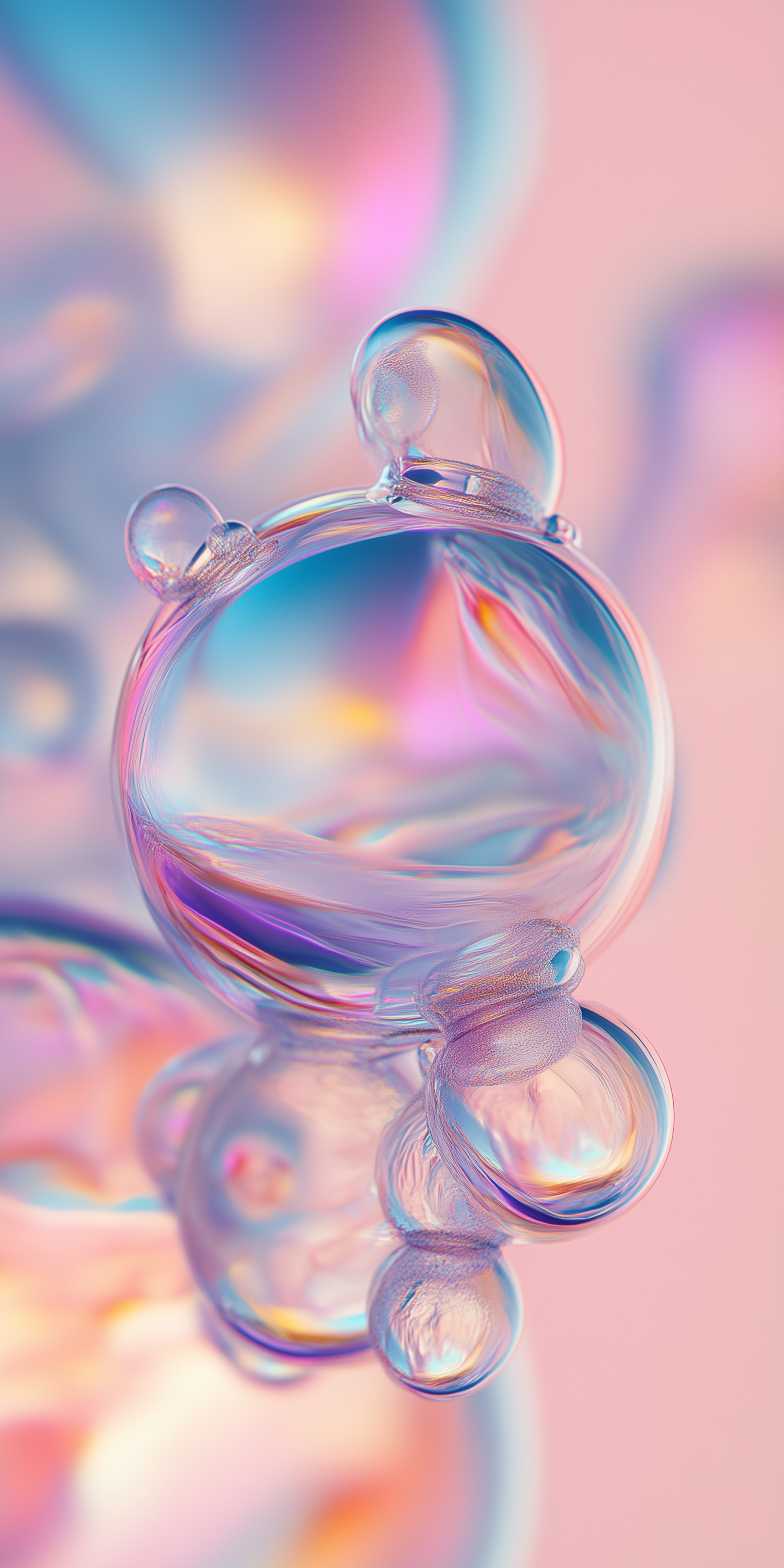 Dreamy iridescent bubbles float against a soft pastel background, creating a calming and ethereal abstract composition.
