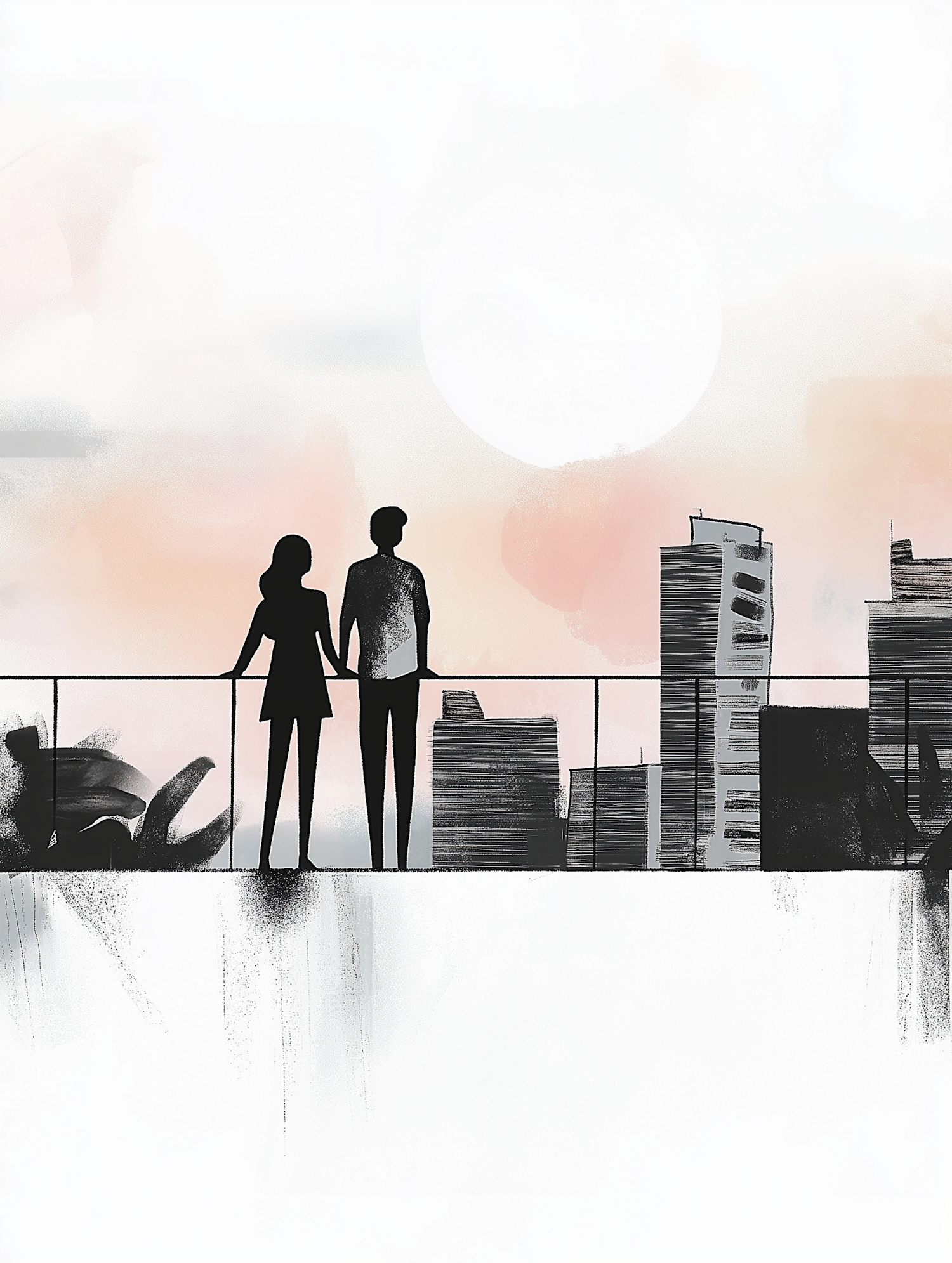 Silhouette of a couple on a balcony against a pastel cityscape, evoking romance and tranquility.