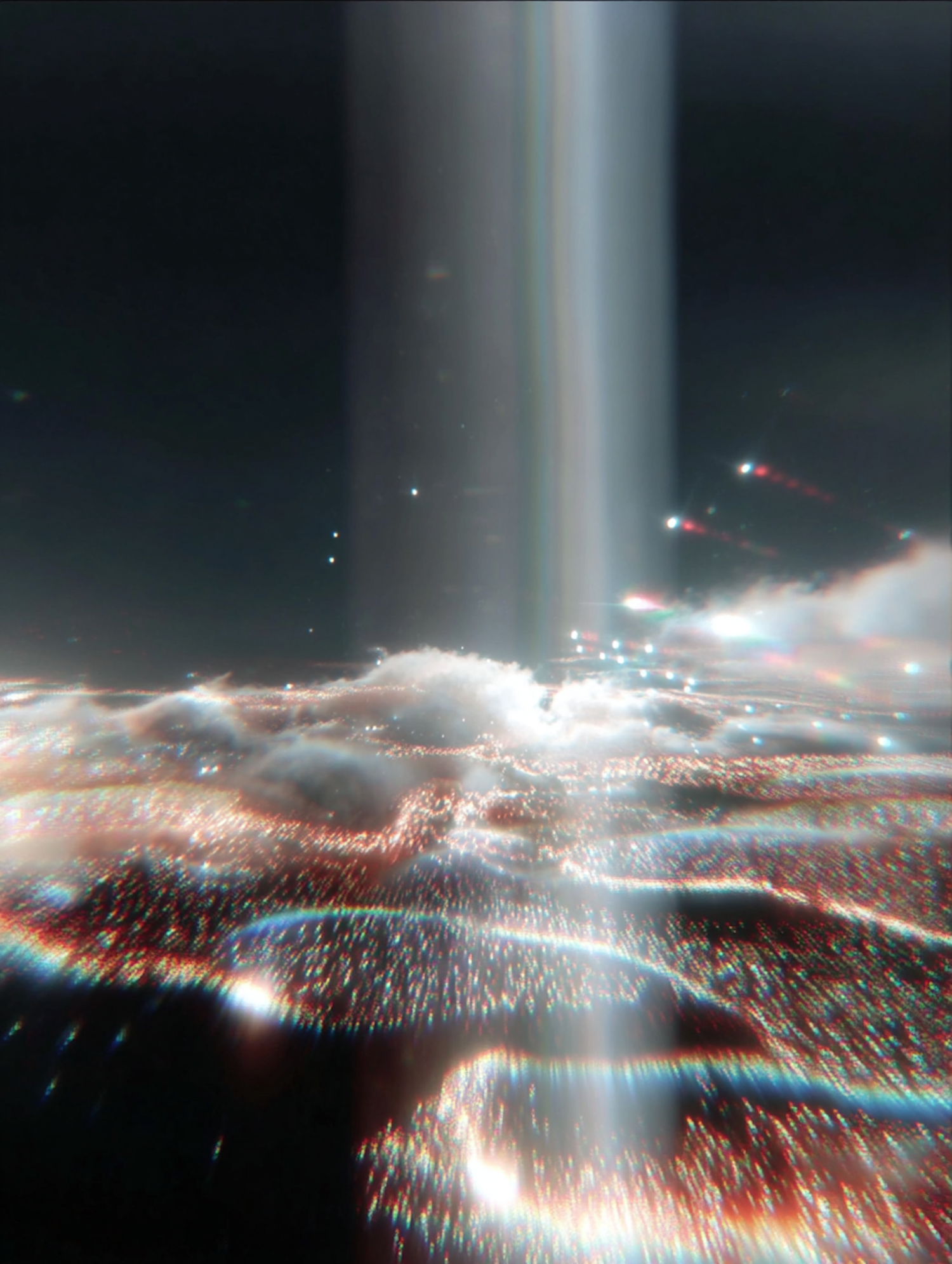 A surreal view of glowing city lights under clouds, with a vertical beam of light and a prismatic, dreamlike atmosphere.