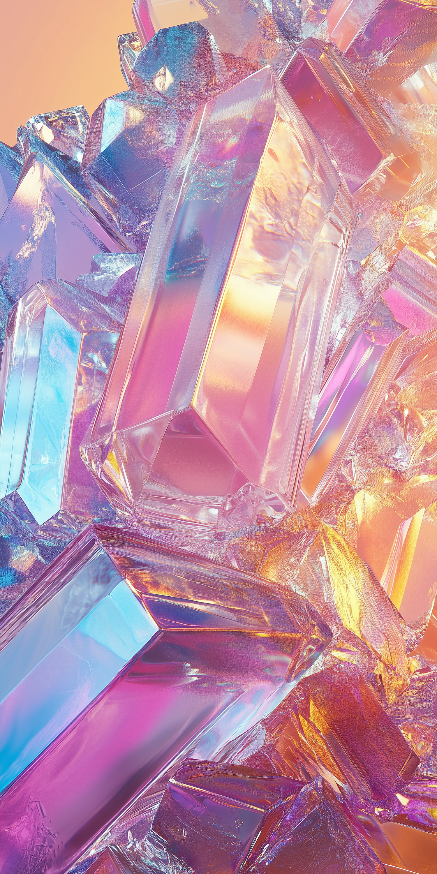 A stunning close-up of colorful, translucent crystals glowing with pastel hues of pink, purple, and blue under soft, warm light.
