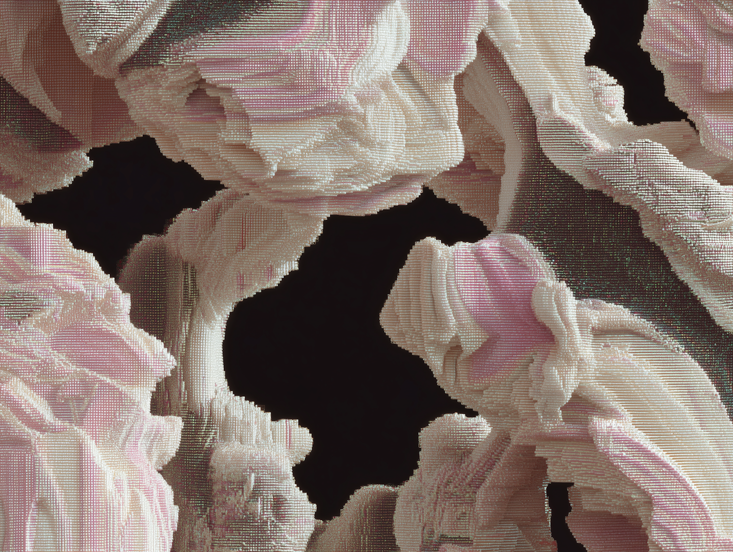 Abstract digital art with flowing pink and white forms on a black background, showcasing intricate textures and a modern aesthetic.