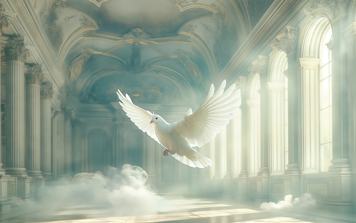 A white dove soars in a grand hall with ornate columns and soft clouds, creating a serene and ethereal atmosphere.