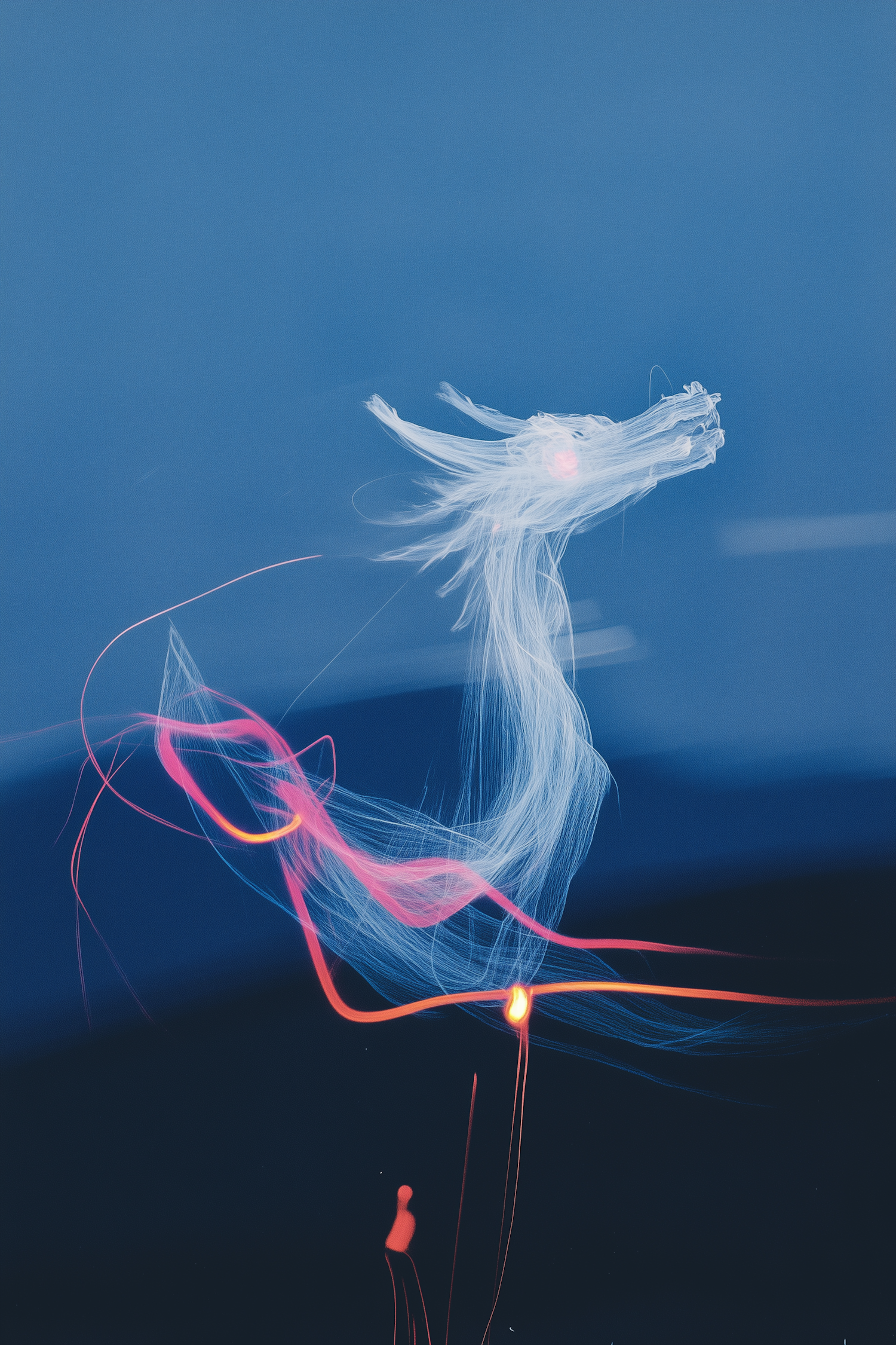 Abstract light painting of a dragon-like figure with flowing white and pink trails on a deep blue background.