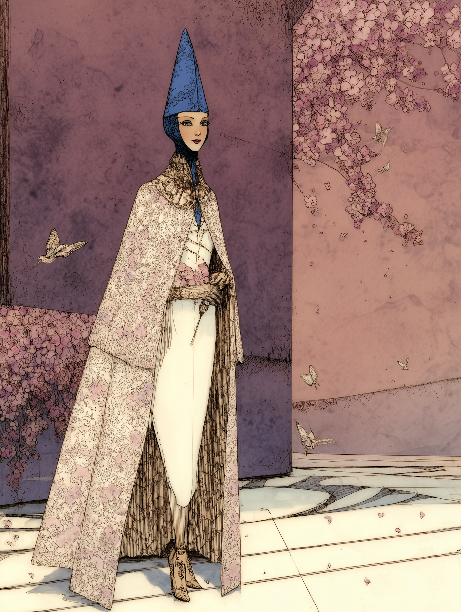 A stylized illustration of a person in a tall blue hat and patterned cape, set against a dreamy pink and purple floral background.