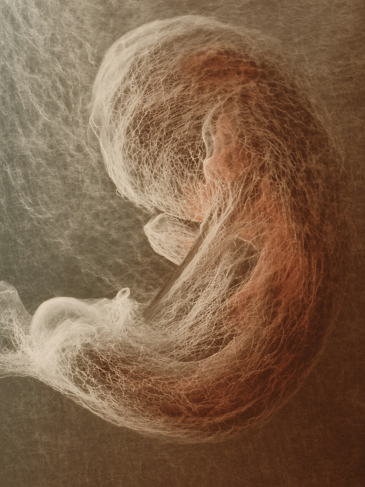 Artistic depiction of a human embryo with intricate, web-like details in warm tones, highlighting the fragility and complexity of life.
