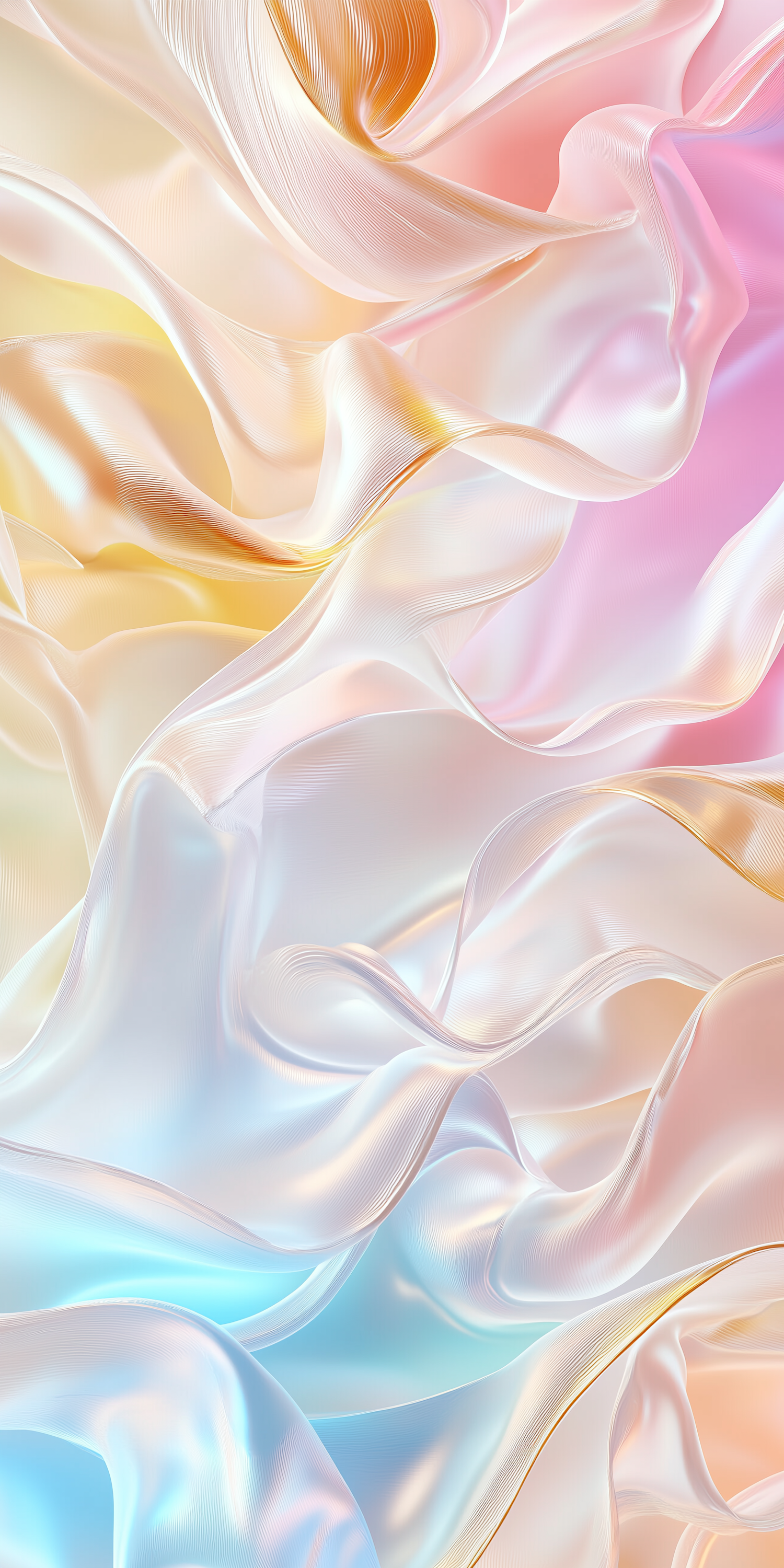 Abstract pastel waves of translucent fabric-like textures in pink, blue, and yellow tones, creating a dreamy and fluid visual effect.