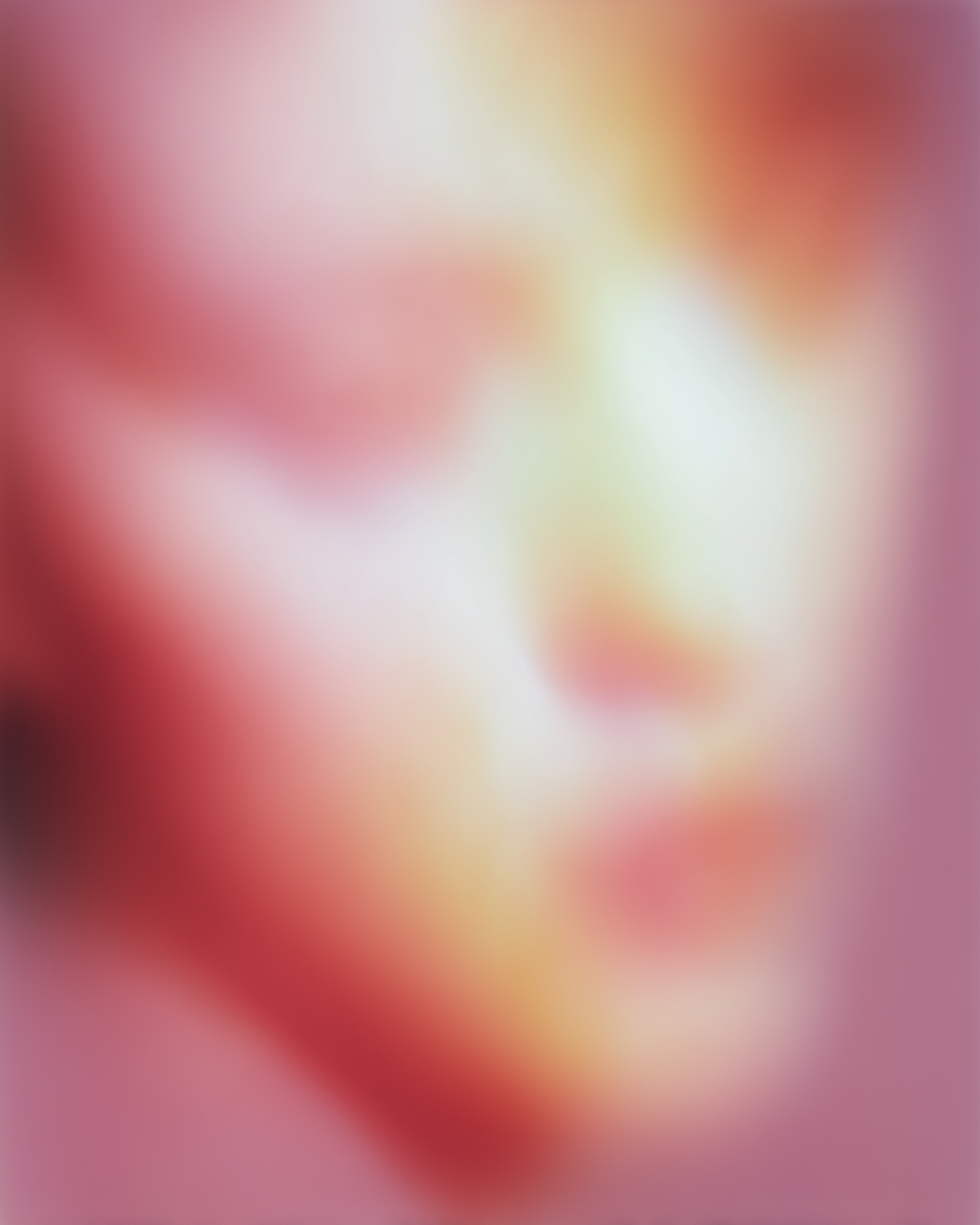 Abstract blurred image of a human face in soft pink, orange, and white tones, creating a dreamy and ethereal effect.