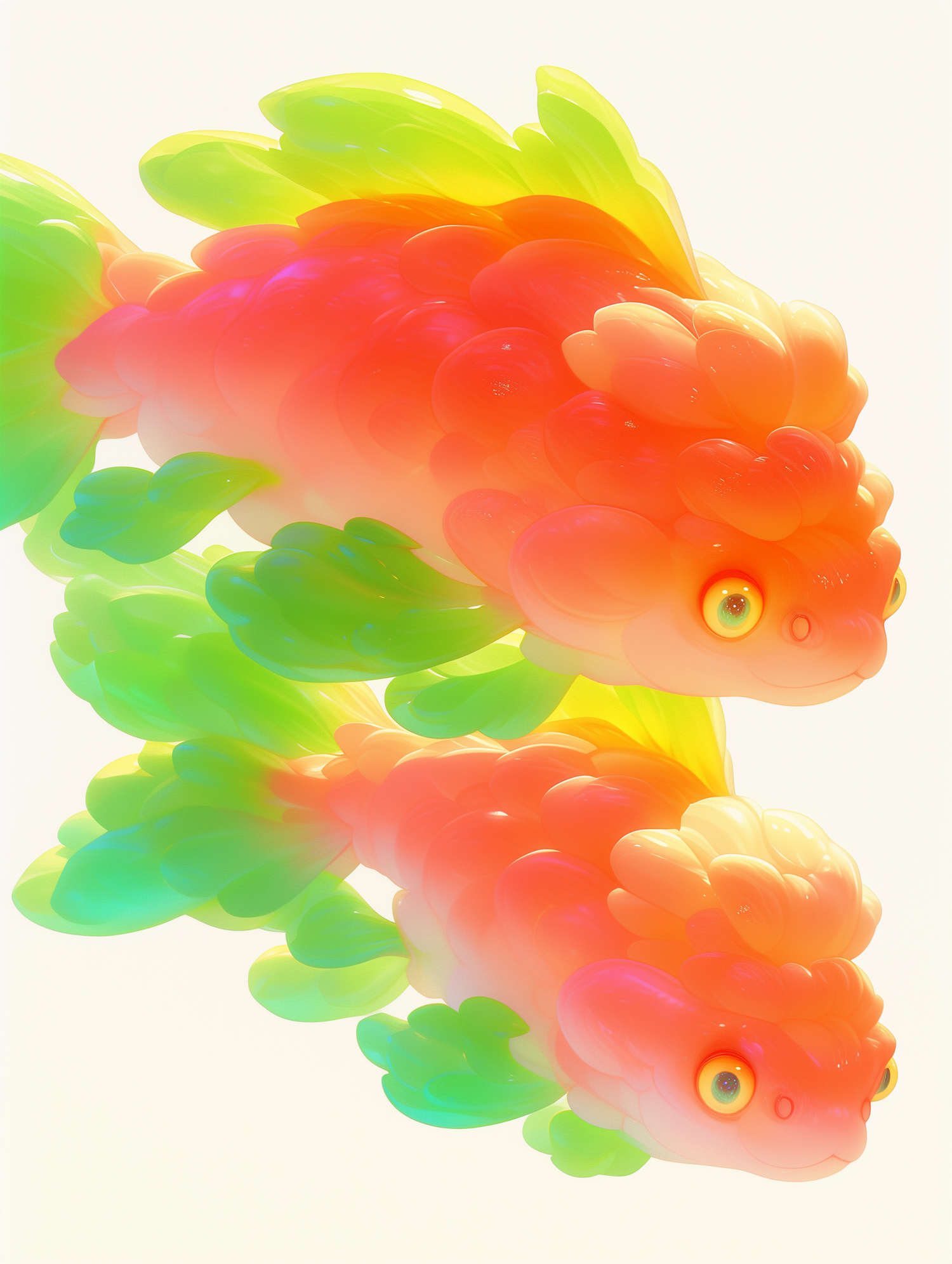Two colorful, fantastical fish with glowing scales and whimsical features swim gracefully in a surreal, light-filled scene.