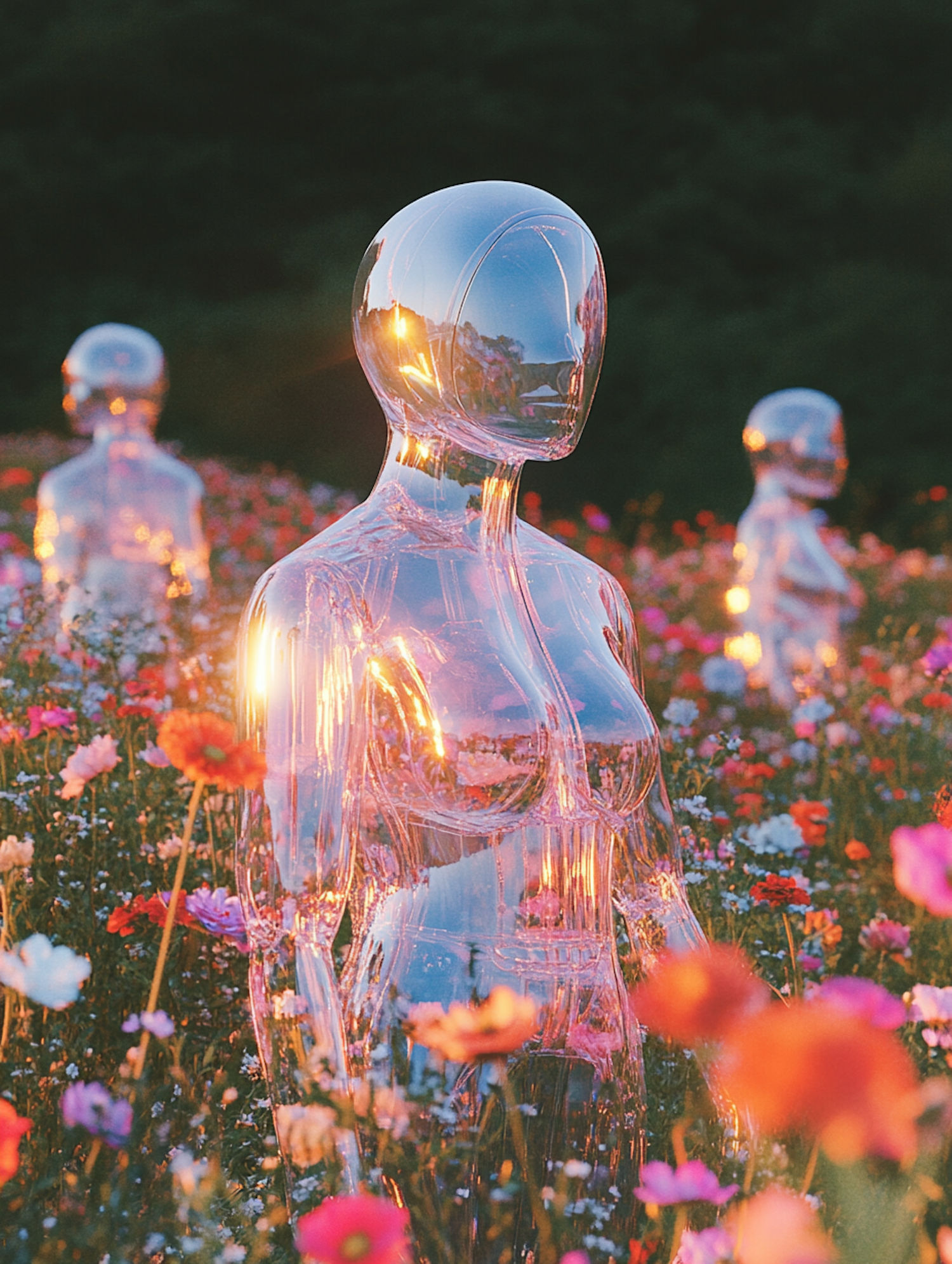 Transparent humanoid figures in a colorful flower field, reflecting sunset light, creating an ethereal and serene scene.