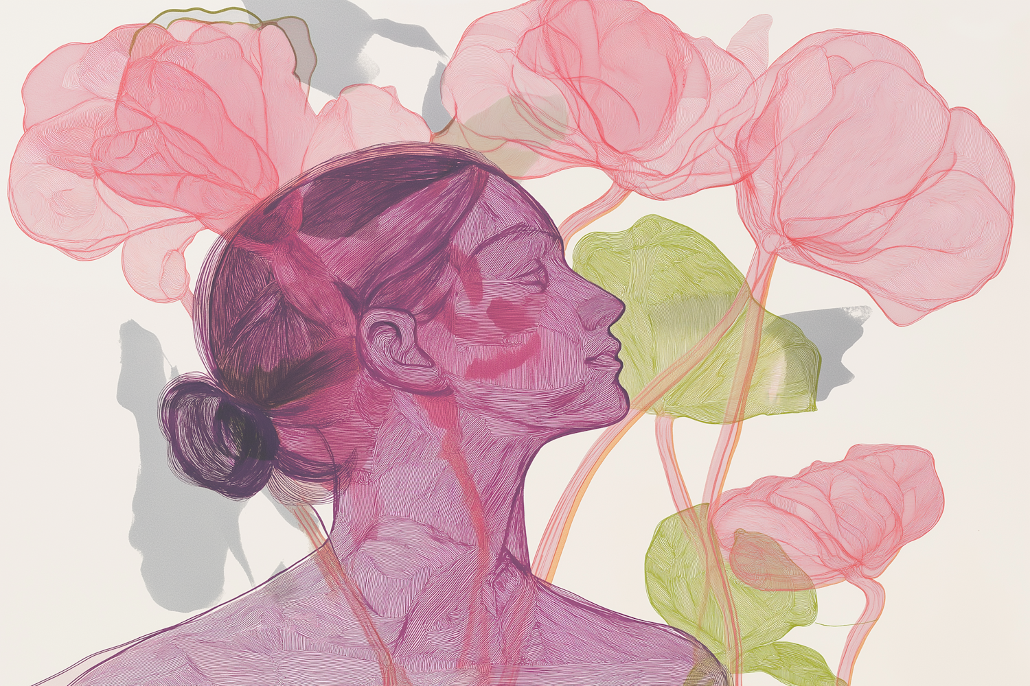 Stylized illustration of a woman with purple skin and pink flowers, blending seamlessly in a soft, ethereal composition.
