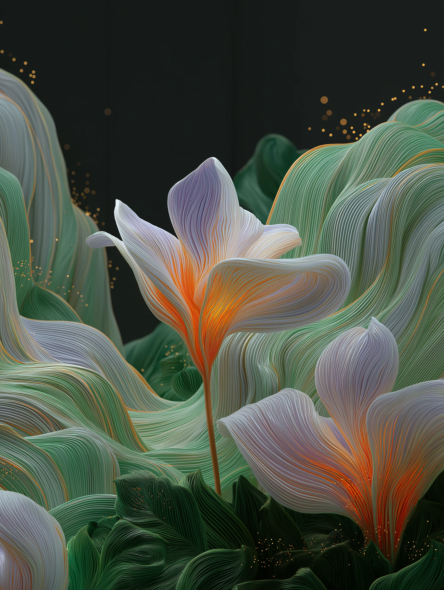 A surreal illustration of glowing flowers and flowing foliage in vibrant colors, set against a dark background with magical details.