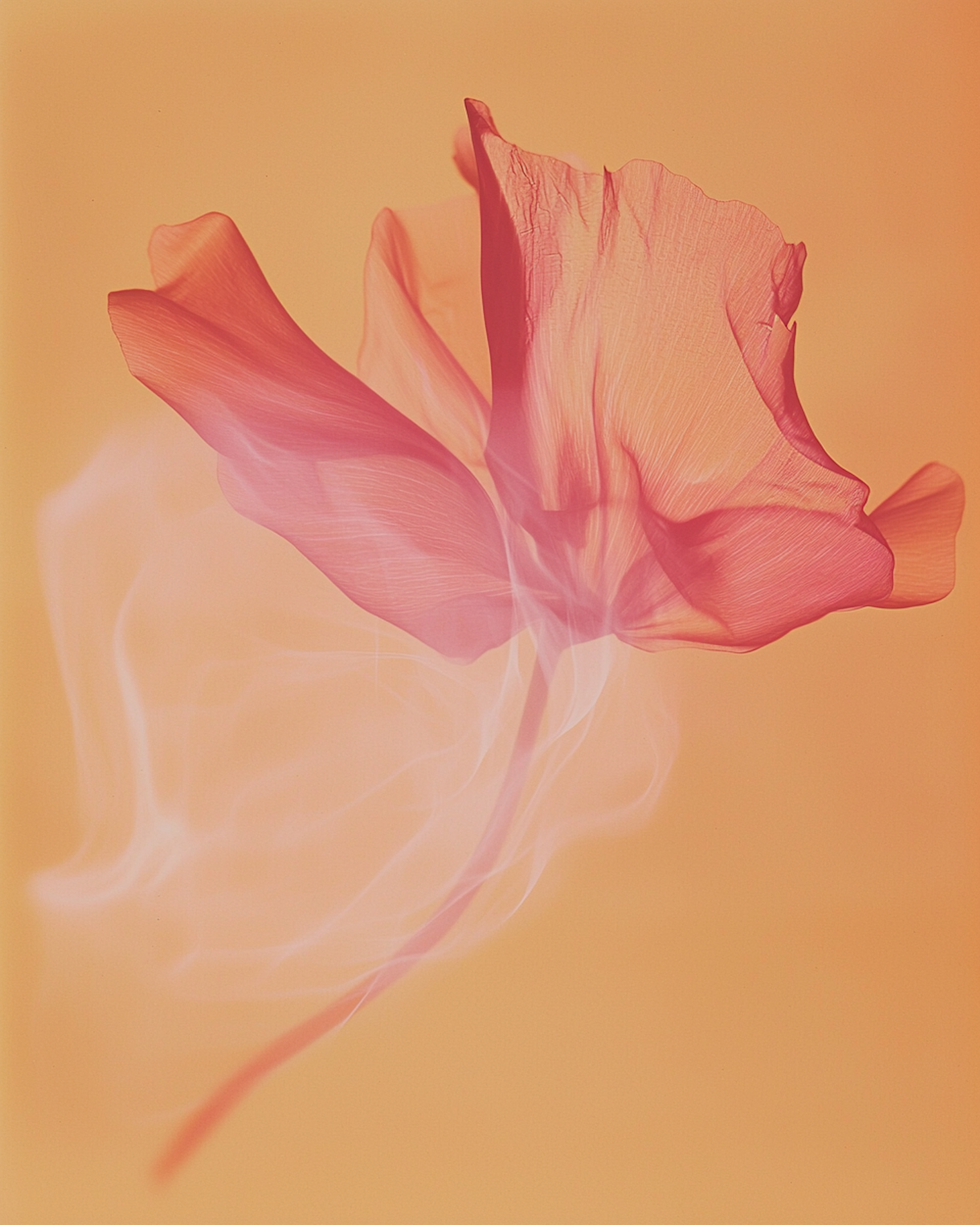A dreamy translucent flower in pink and coral hues floats against a warm orange background, with smoke-like wisps adding a surreal touch.